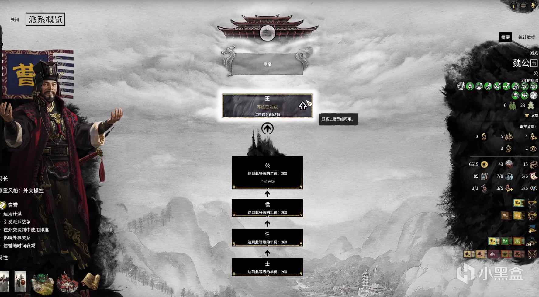 一共五个选项,相比于西方的公侯伯子男,全战三国有王选项,分别是王公侯伯士。派系系统也是大改,玩家可以在这个界面选择自己的派系未来的发展方向,比如派出细作或者是对商队加成,也就是外交和商业,这取决于玩家的选择。