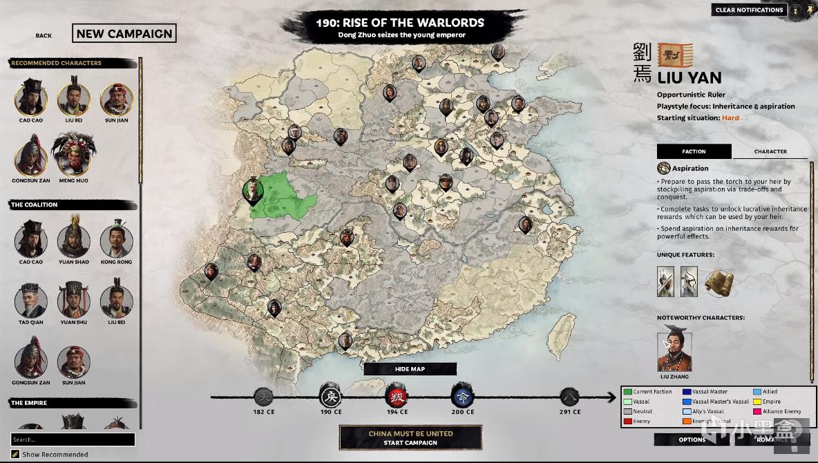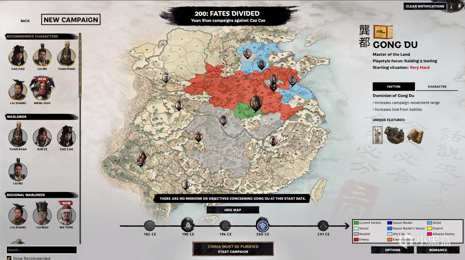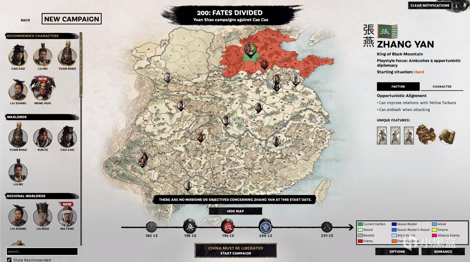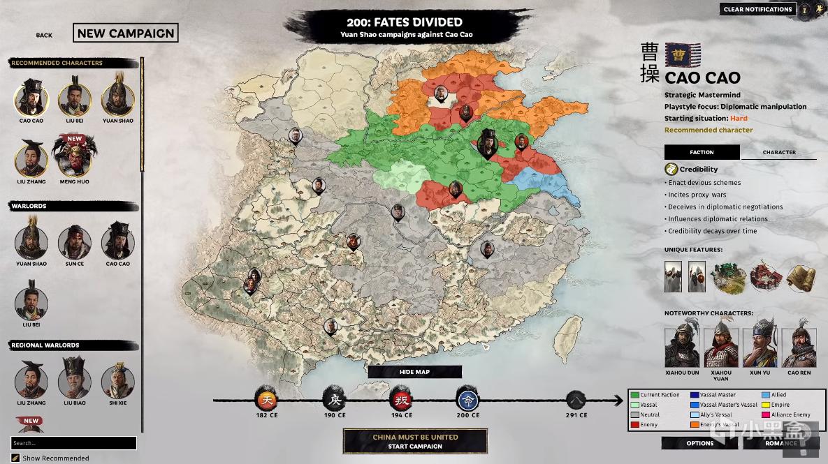 在200年官渡之战中,玩家一共可以使用13个派系,根据玩家之前购买的DLC可以解锁一些特殊的派系。笔者已经购买了新DLC,但未获得试玩权限,下面图片来自YT的Serious Trivia。