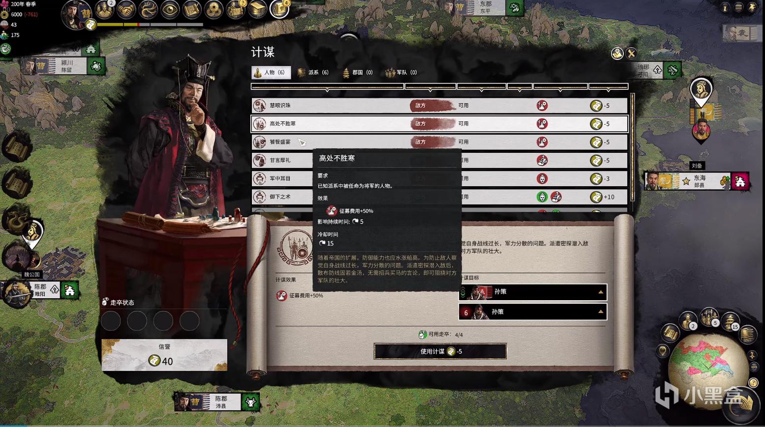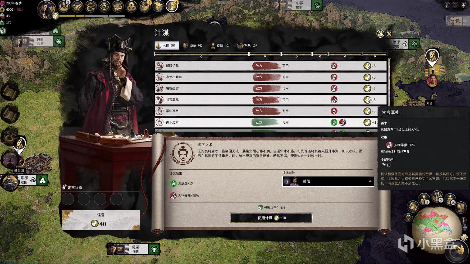 而计谋目标需要消耗“走卒”,有点像细作,这个改动会影响玩家的大战略,提供更多的玩法;曹操除了慧眼识珠还有高处不胜寒、饕餮盛宴、甘言厚礼、军中耳目,以上五个计谋都是对敌方使用,御下之术和褒美嘉许对自己人使用,都有极大的增益BUFF。