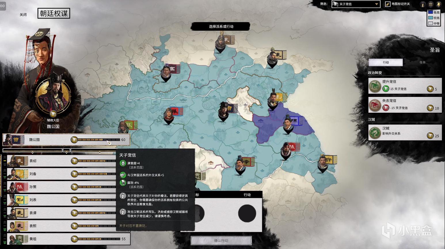 天子可以对宠幸度低的派系进行操作,可选择将其判定成汉贼,届时全天下会发布汉室要务:讨逆平乱,天子下诏讨逆,您身为大汉忠臣,自当领受皇命,率先征讨不臣。完成任务的派系可获得宠信+10,持续3回合。