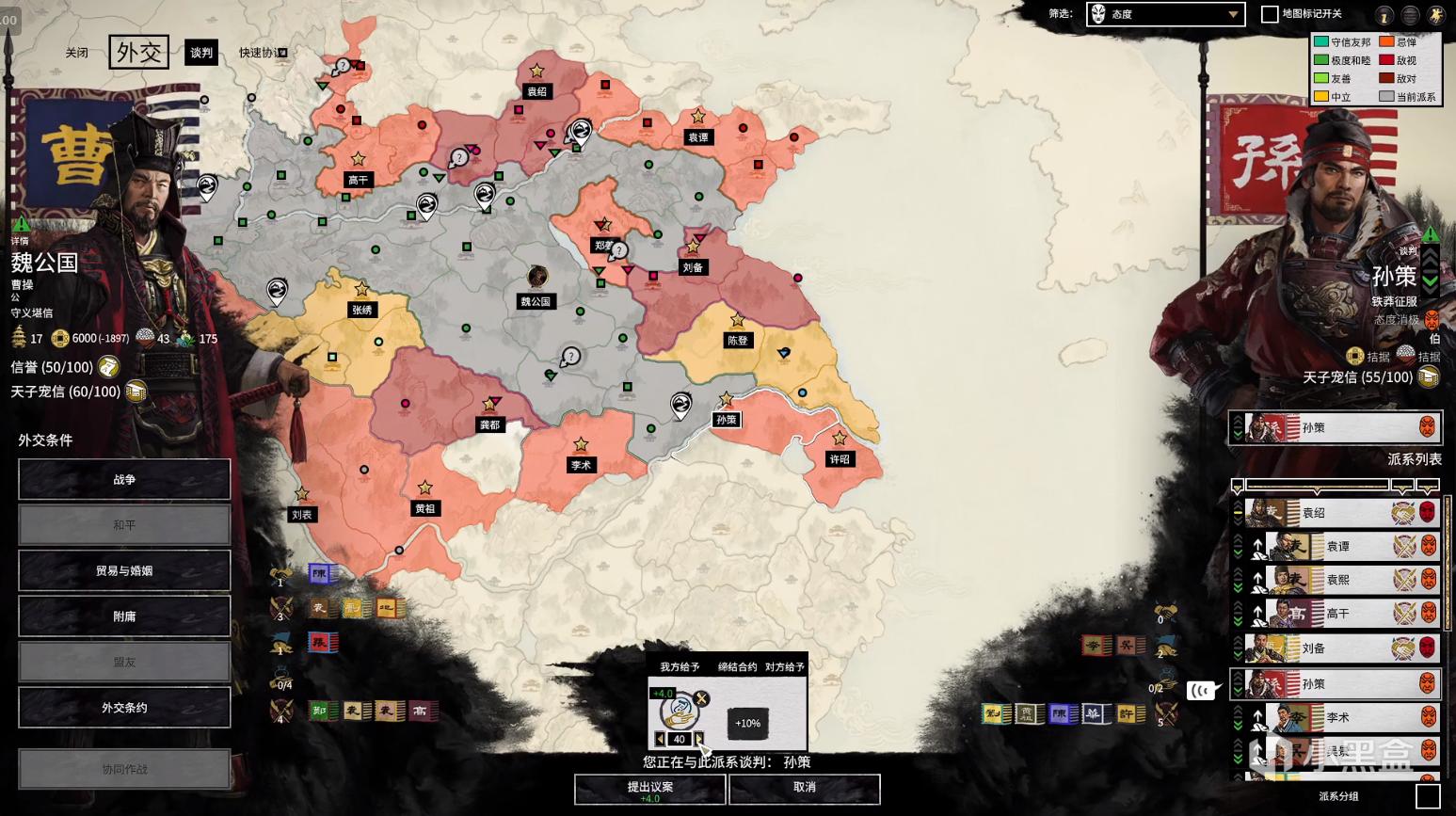 诸侯派系为袁绍、孙策、曹操和刘备。