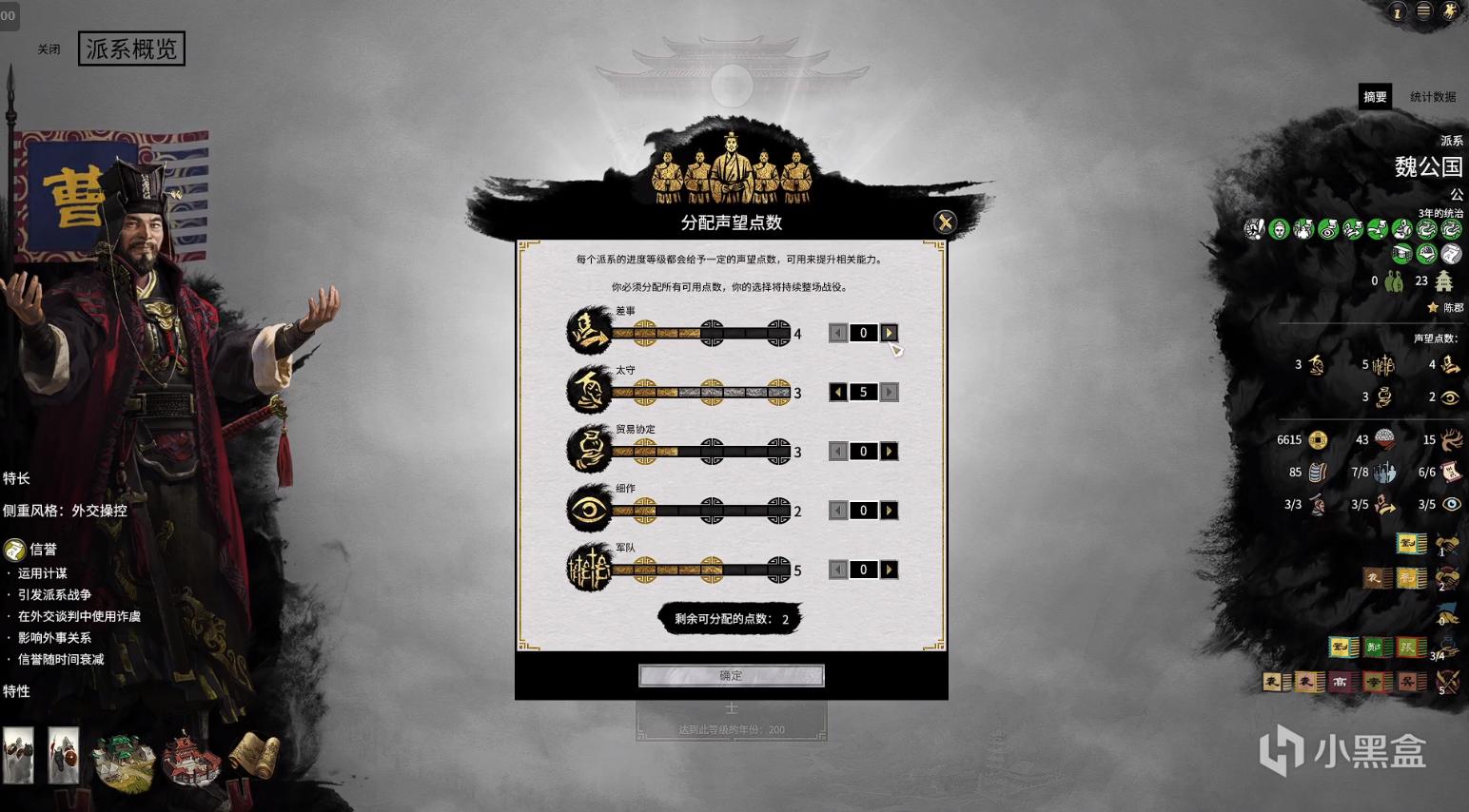 派系发展等级系统拓展之后,升级奖励从固定内容变为可主动定制。玩家达到新的发展等级后,将得到声望点数,可用于增加差事、太守和贸易协定等内容的上限。有了这项功能,汉家派系就能够将在战役地图上扩张获得的声望,投入自己认为合适的领域中来促进派系进一步发展。