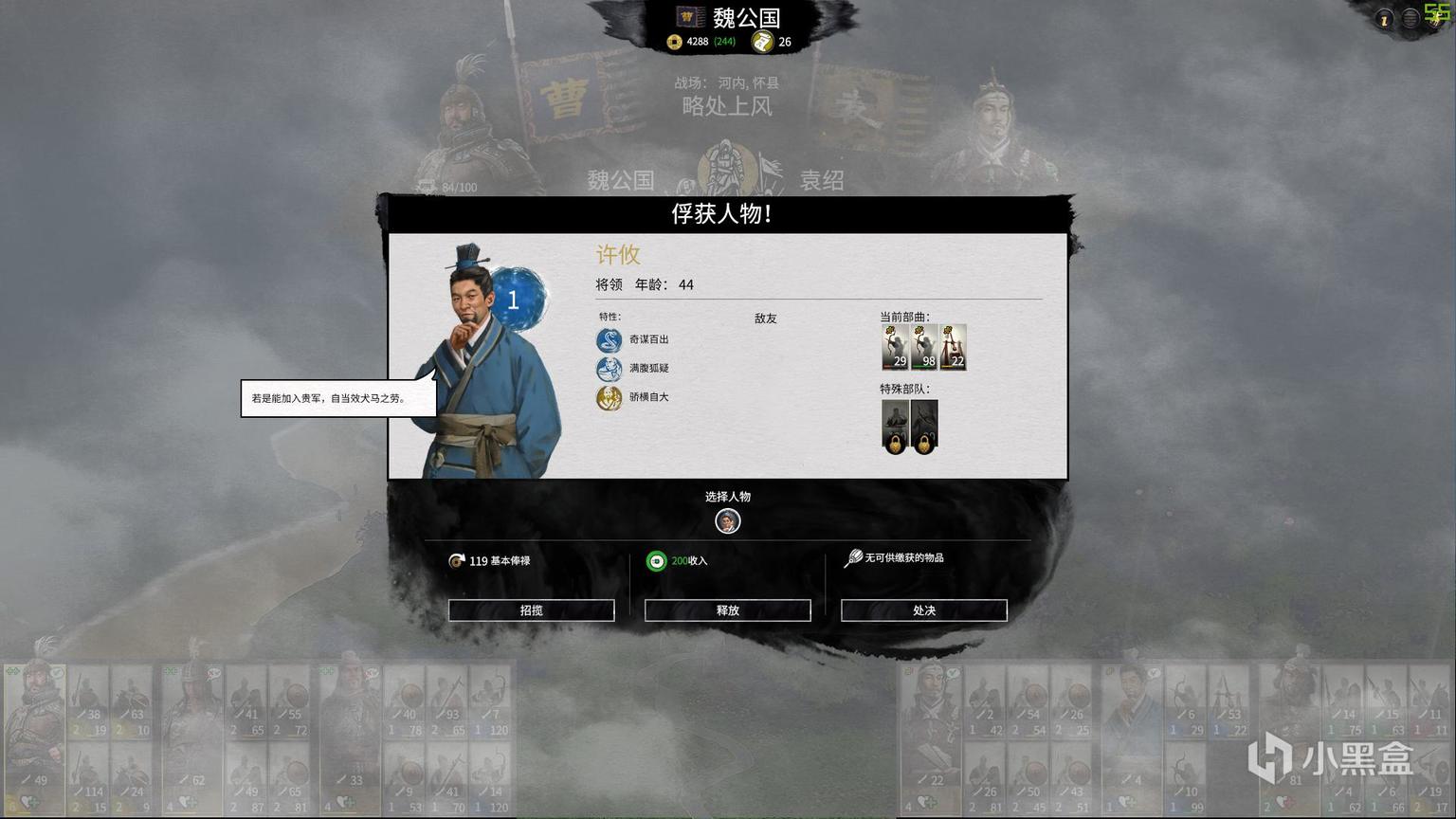 初时我选择了曹操作为开局首秀,然后因技艺不精被袁绍于官渡击溃后果断重新选择了袁绍作为破局对象。在上帝视角下与附庸勠力同心,很快便改写了历史成为了北方霸主,而在赢得官渡之战后,我获得了一个北军校尉,该随从可被装备至任意武将身上,装备了北军校尉的武将将可招募本DLC的新特殊兵种,而袁绍派系能够招募的部队名为“北军游骑”。该部队分为可持双手戟的弓骑兵和来自匈奴的剑盾骑兵,北军游骑的机动性与攻击力在游戏中后期的作用将显得愈发重要。