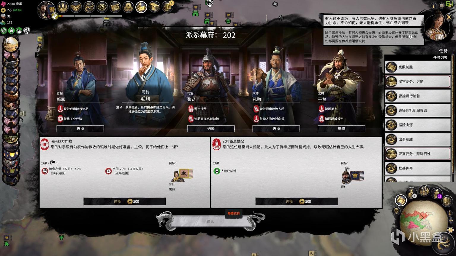 在“命运分野”里玩家可以在游戏中每年春季时召开幕府会议,幕府由玩家任命的官员组成,从丞相到太尉等五名官员每人分别提供两个进言供玩家抉择,进言的采纳需要消耗金钱,只要金钱足够便可以将五名官员的进言全部采纳。
