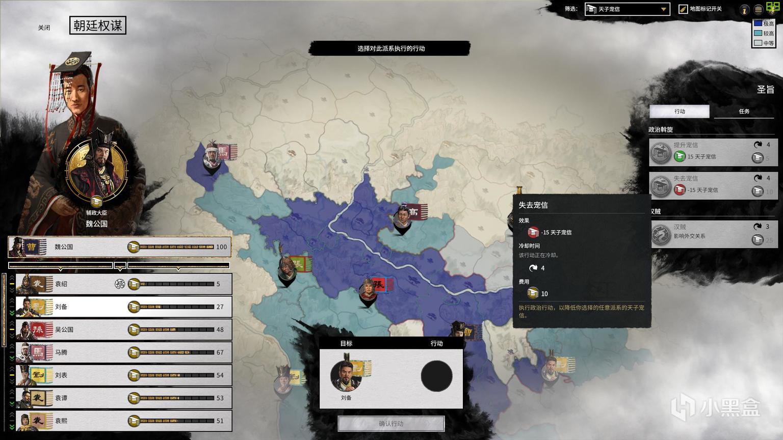 除了出谋划策外,“命运分野”还新增了天子宠幸这一设定,各大势力皆有一个关于天子宠幸的数值,该数值增高会获得一些增益,而降低则有可能被宣布为汉贼,被宣布为汉贼后会被大量非汉贼势力宣战,陷入不断征战的泥沼当中。宠幸数值的增减除了利用每局的“政治斡旋”选项进行调整外,攻击汉贼派系或非汉贼派系也会导致宠幸数值增加或是减少。