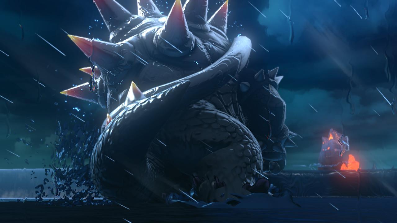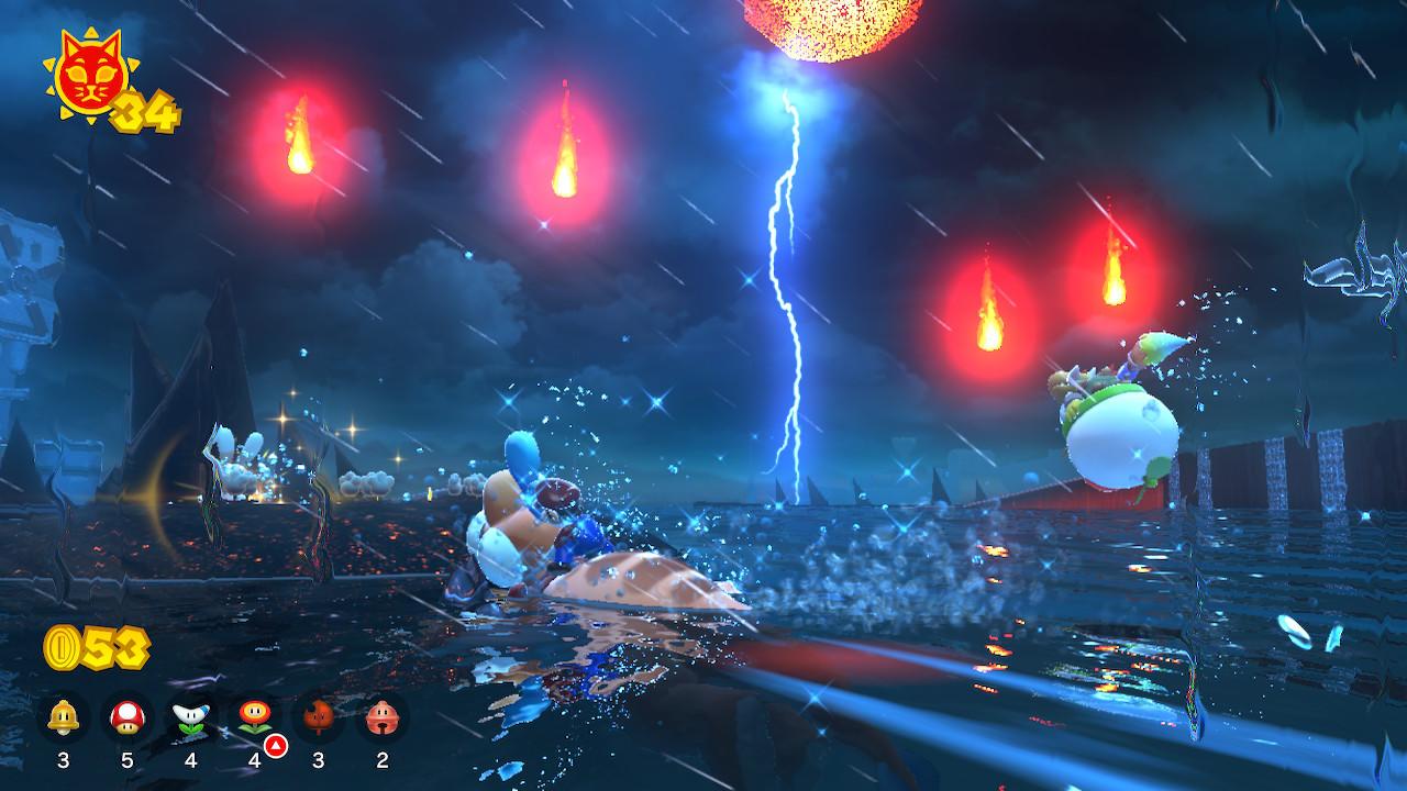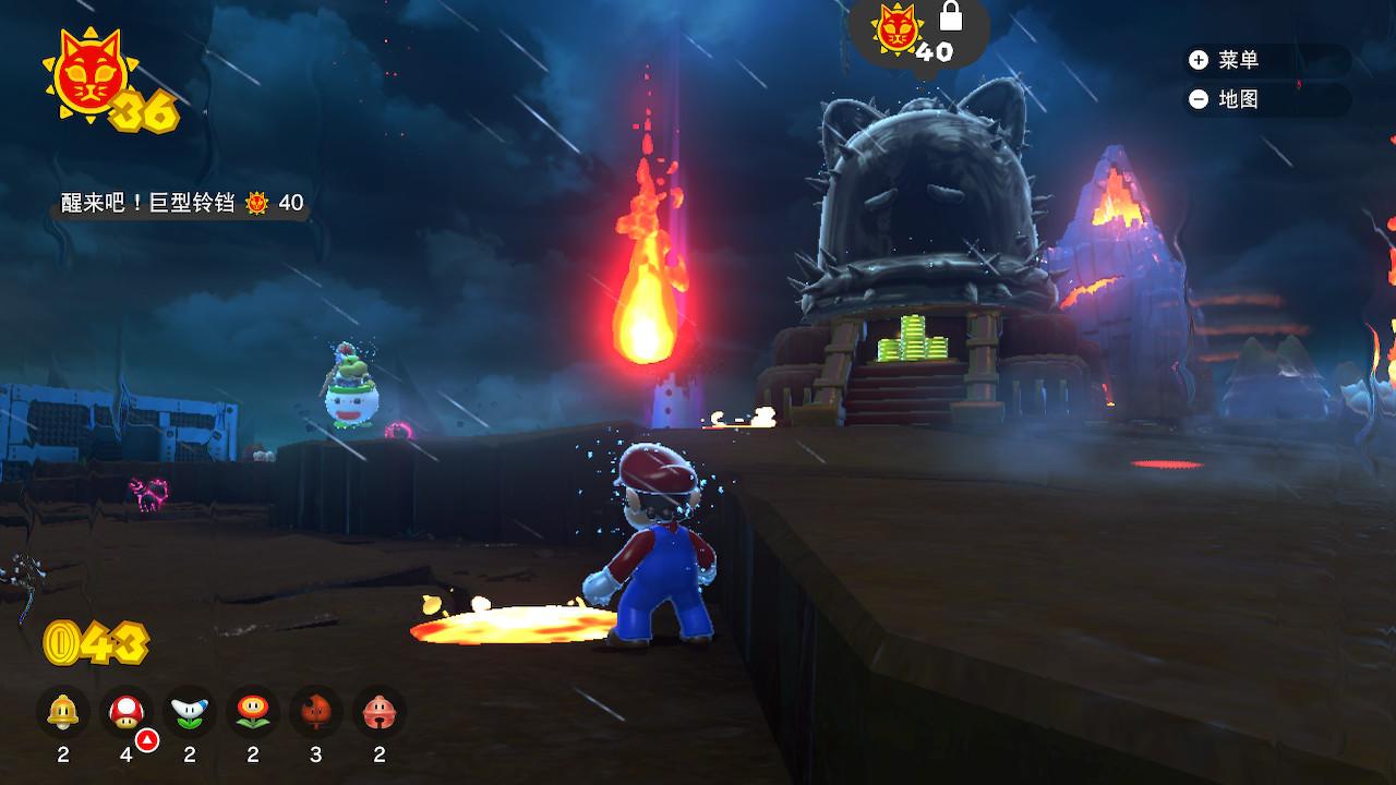 每当库巴来临时,“大世界”将开始狂风暴雨,同时火焰和方型热岩石块会不断地从天而降。如果这时候我们并没有达到解锁当前“巨大铃铛”所要消耗的太阳数量时,我们只能选择继续游玩关卡、通过任务。前面说到的从天而降的方型热岩石块,其摆放位置并非随机,而是设计好的。我们也可以用它们进行跳跃、攀爬等多种操作,这意味着库巴来临时的关卡模式是略微有别于库巴不在场时的。