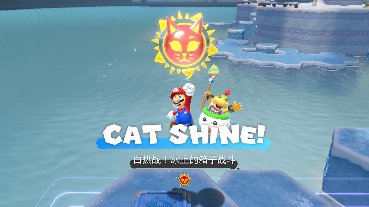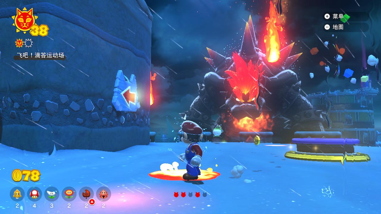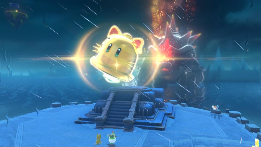 当库巴出于原地不动、肚子朝上的龟壳状态时,我们使用屁股墩砸地跳(空中按ZL)对其造成大量伤害(这个伤害要远远高于用猫形态抓,是Boss战的主要输出手段)。每次成功将库巴血量削减为零时,地图会解锁下一块新的“大陆”,库巴血量回满并进入下一阶段(主要体现在增加新技能)。“巨大铃铛”带来的“极巨化”存在时间限制,状态结束后铃铛会被再次封印,需要消耗更多的太阳来解锁。