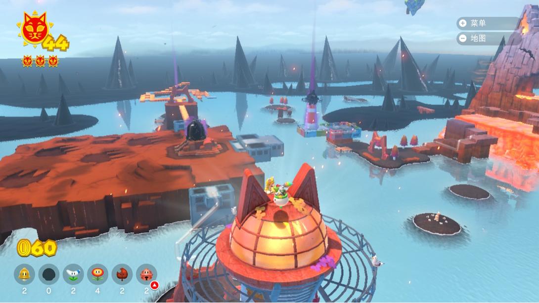 游戏中总共存在三块风格迥异的“大陆”,主题分别是海岛、冰川和火山,所有的关卡被放置在这三块“大陆”中,而这三块“大陆”被“湖水”要素无缝连接在一起。每块“大陆”关卡存在且仅存在一个“巨大铃铛”,需要我们使用从各个关卡中收集的太阳解锁。使用“巨大铃铛”的马里奥获得一个“铃铛”道具(变成猫形态)的buff并同时变得“极巨化”,与库巴进行Boss战。