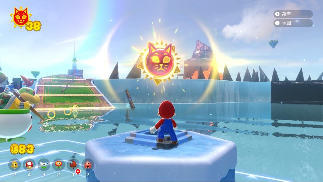 “箱庭”依旧是那个“箱庭”,玩家们却变得更自由了,可以随意到“大世界”中的任何一个地方(没解锁的区域除外)。同时由于“开放世界”的性质,能够拿到太阳(等同于《超级马里奥3D世界》中星星)的途径也变得更加多元化。