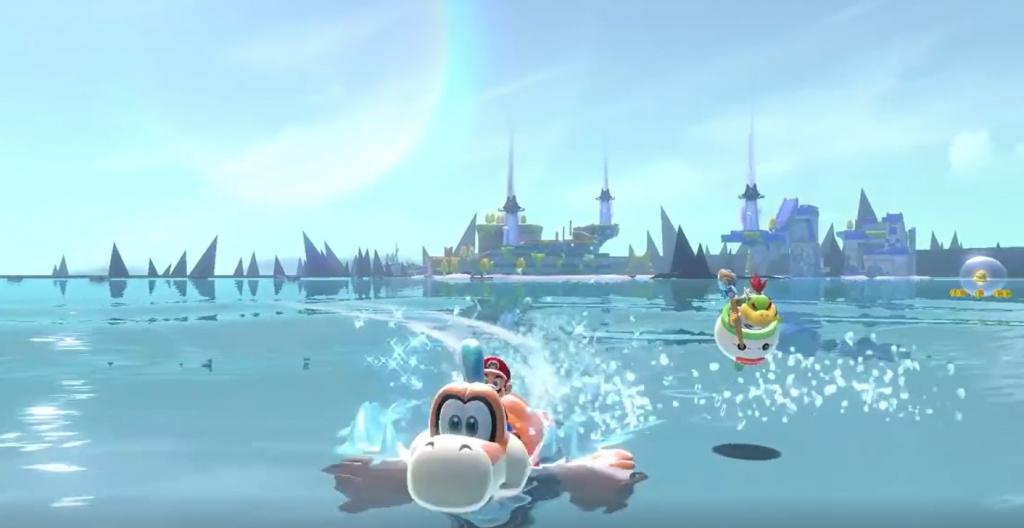 再提一点,因为马里奥在水中的行进速度很慢,而《狂怒世界》中又充满了“湖水”,所以充当水中坐骑的浦雷斯作为我们探索“大世界”的可靠帮手,其使用率获得了大幅的提升。游戏中存在有很多浦雷斯,免去了我们在其他开放世界游戏中经常会遇到的寻找坐骑/载具的烦恼,更是有其独属的太阳任务——骑着浦雷斯在限定时间内完成特定赛道,太阳则位于赛道的终点。