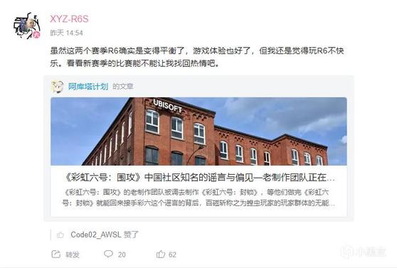 一方面,社区里绝大部分玩家乐于接受电竞化、竞技化改动,毕竟CSGO、APEX等成功的例子就摆在那里,想让彩六也能活得长久只能向电竞化狂奔;另一方面,又有相当多的声音在抗拒育碧对彩六近期的调整,认为育碧剥夺了他们的快乐。诚然抗拒的声音中是有一些“蝗虫玩家”(百词斩发明的词,代指跟风和云玩)带出来的节奏,但我们无法忽视的是——哪怕只是带节奏的恶意发言,也获得了相当多的赞同。