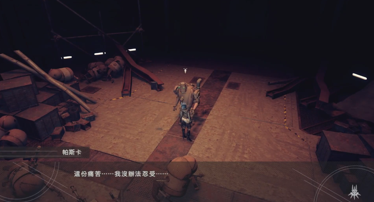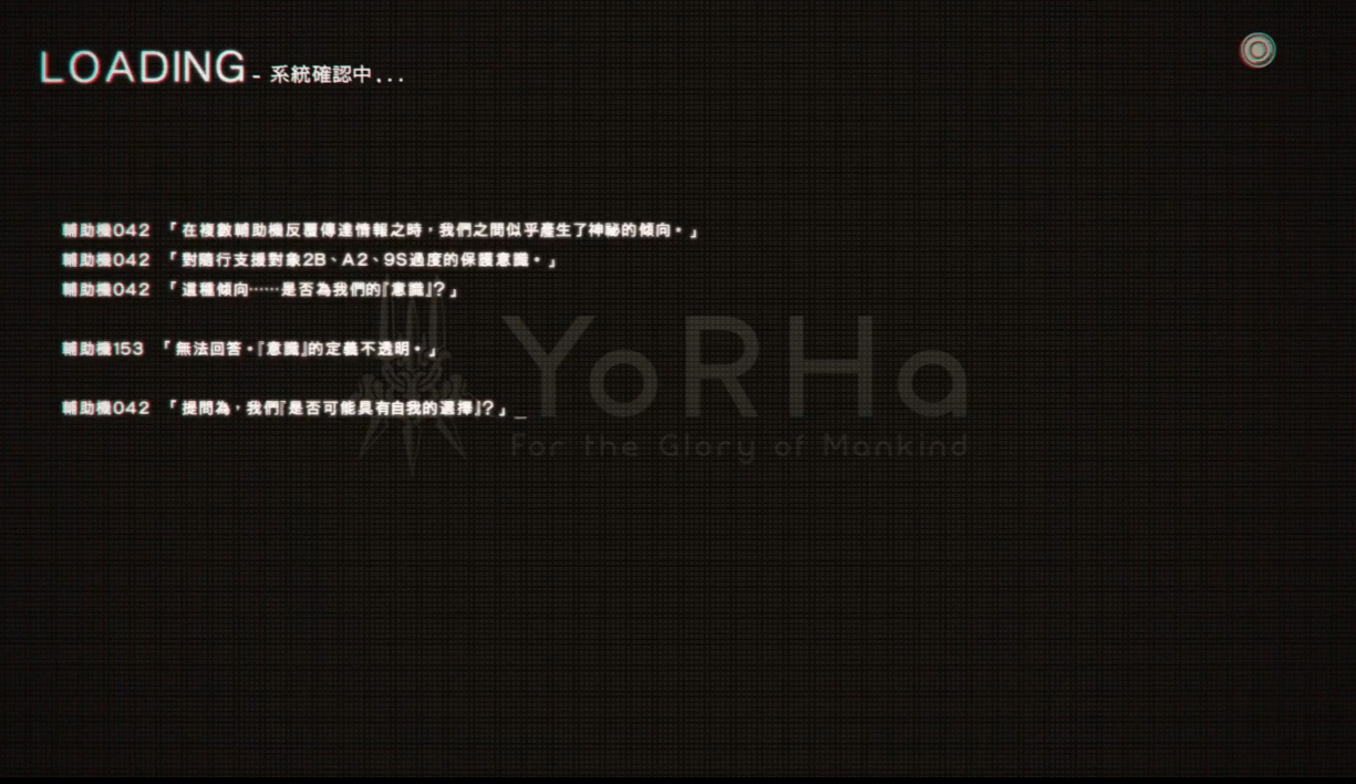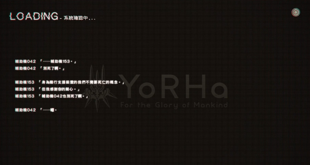 转场加载画面中再次出现了辅助机的对话,这一路上辅助机之间的对话很多,它们会关注9S的情况,甚至可以察觉到9S对A2的仇恨而尽可能避免二人的见面。而这次,辅助机之间的对话中情感的表达更加流畅明显了。
