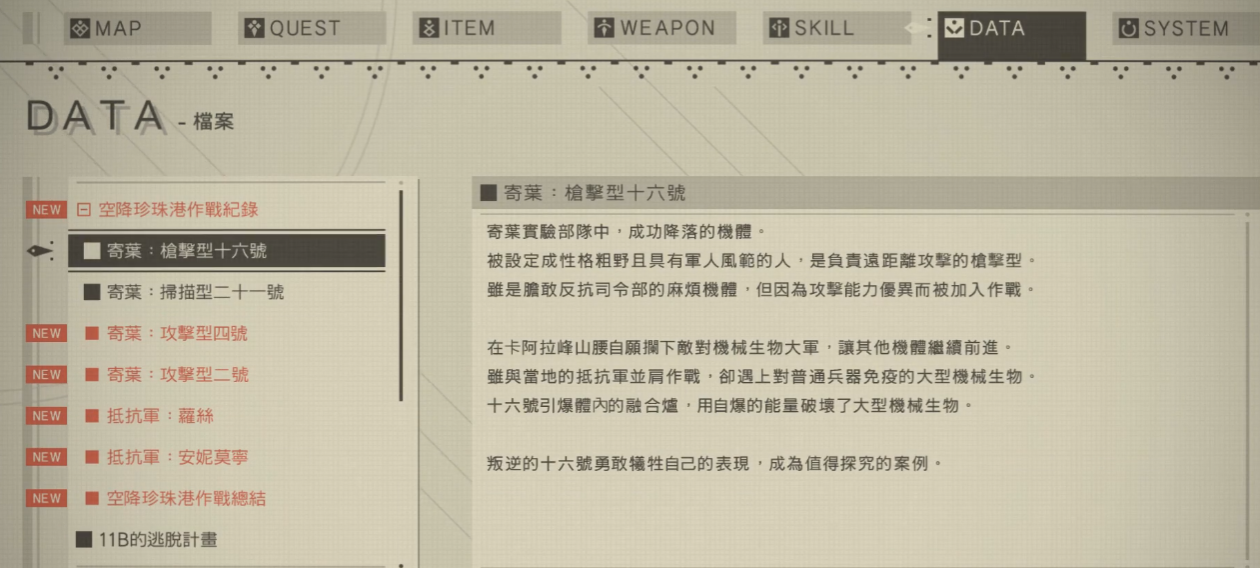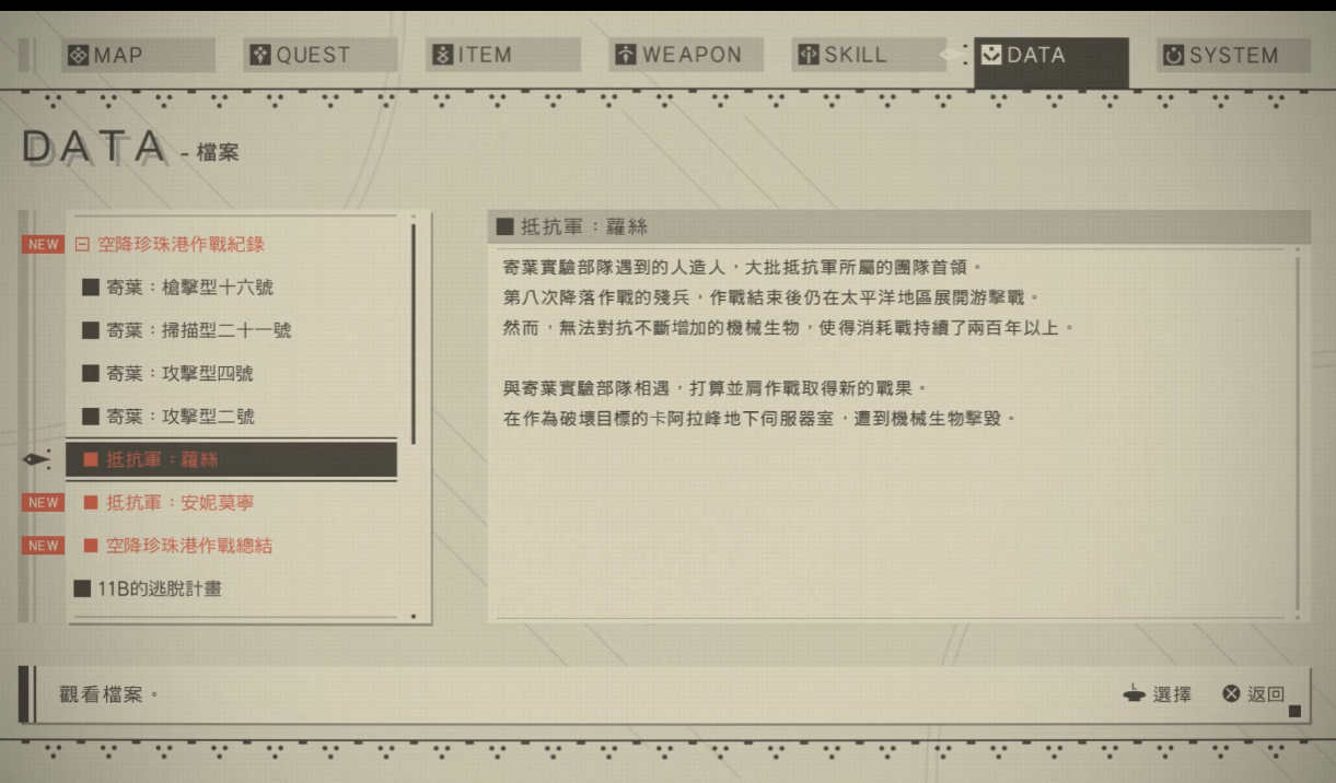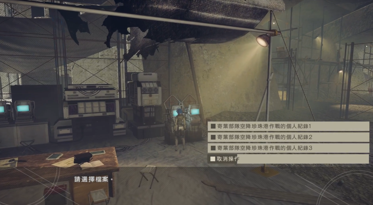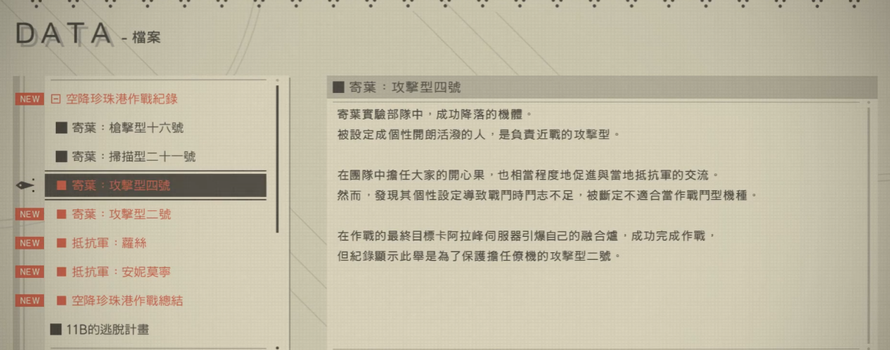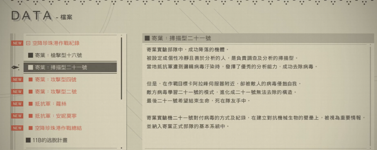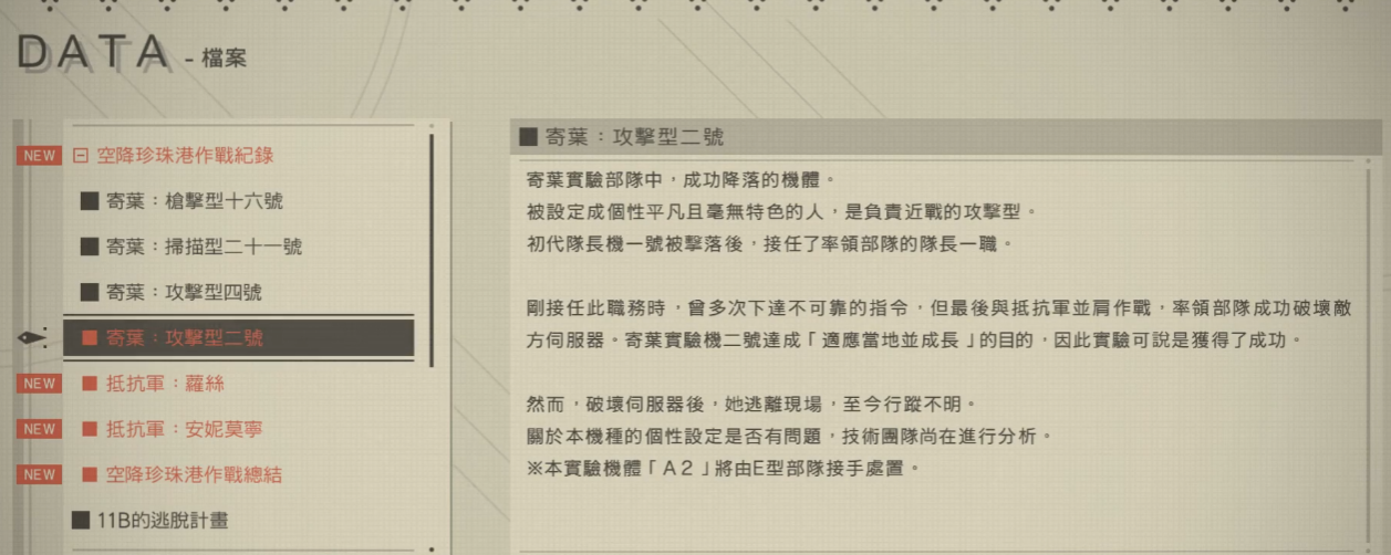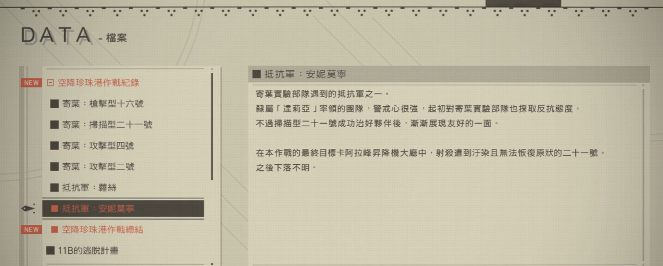 此时到首领身后右侧两台并排的机器那里可以看到关于空降珍珠港的作战记录,那是关于A2和首领过去的故事:首领名为安妮莫宁,是人造人抵抗军领袖,她将这份战斗败北的记录留在这里以警惕自己。