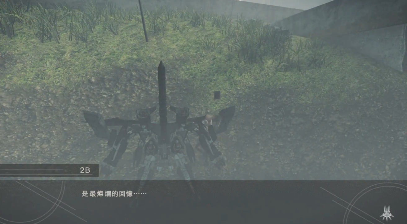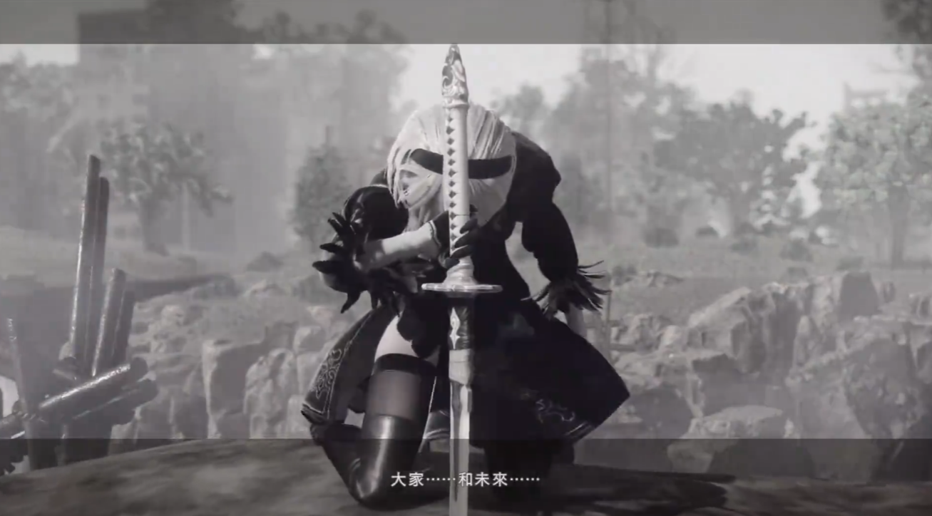 此刻的2B已经没有力气站起来了,她用手里刀划开自己的眼罩(还记得我在A线中说的本作中唯二的不使用特殊道具可以看到2B真颜的画面吗,这里就是最后一次)将自己的记忆传入白之约定的存储芯片中,泛着红光的眸子看了A2一眼,然后双手将剑重重地插在面前的泥土中,跪在了A2面前。