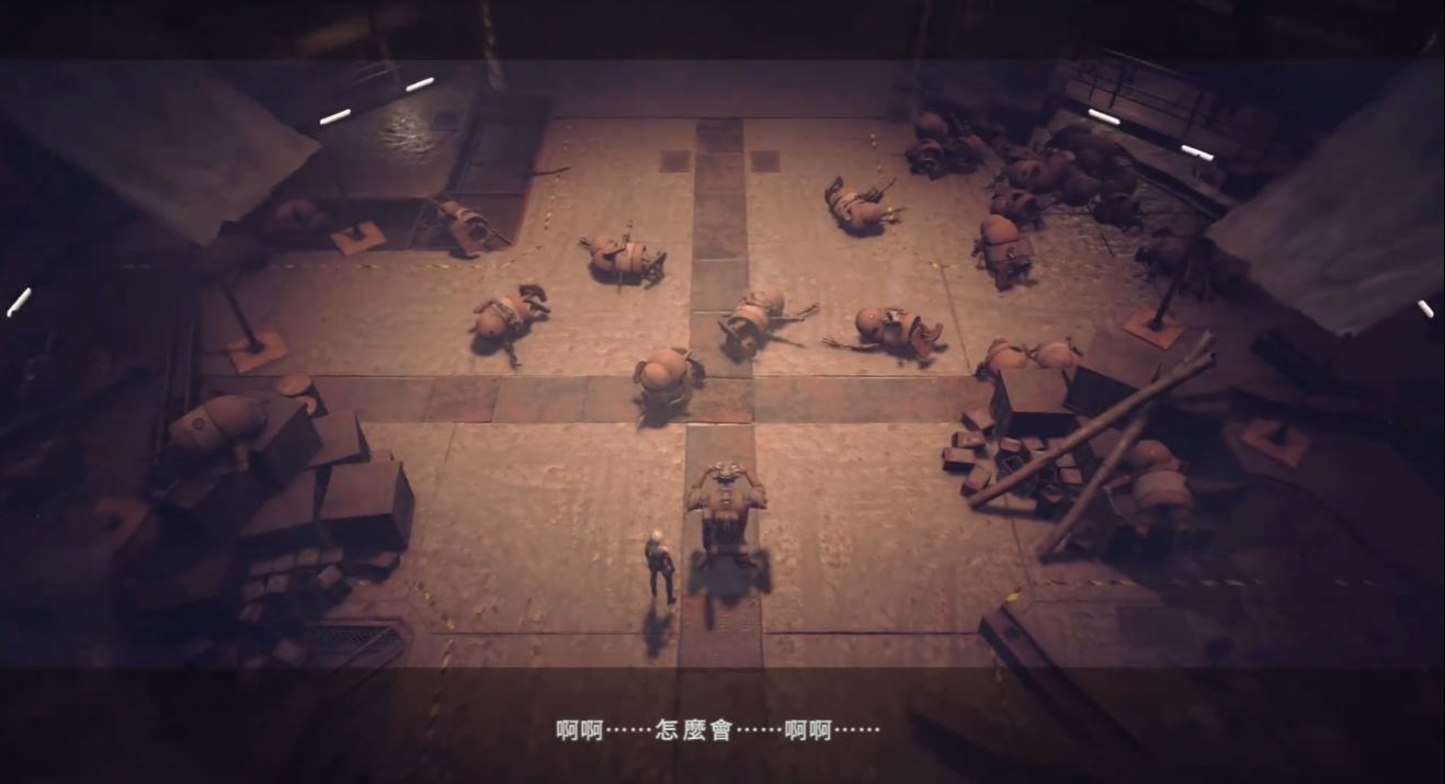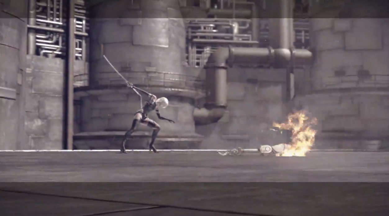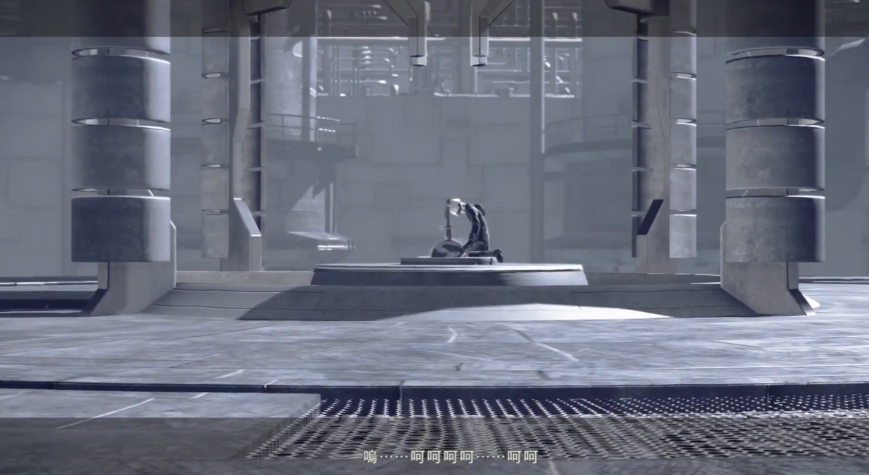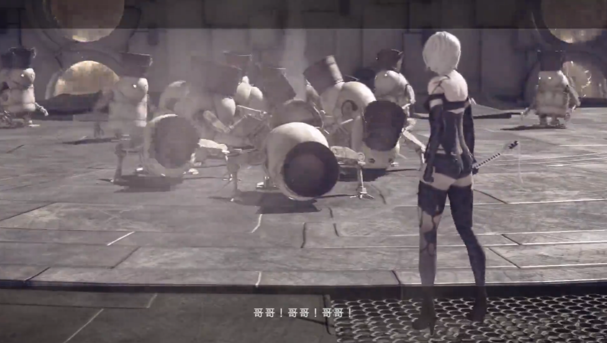 杀死被控制的21O后,A2与被仇恨蒙蔽理智的9S陷入对峙,僵持中9S的脚下突然坍塌。还不等A2反应过来,身后的平台又出现了一个由一个大机械和一群小机械合体的怪物。