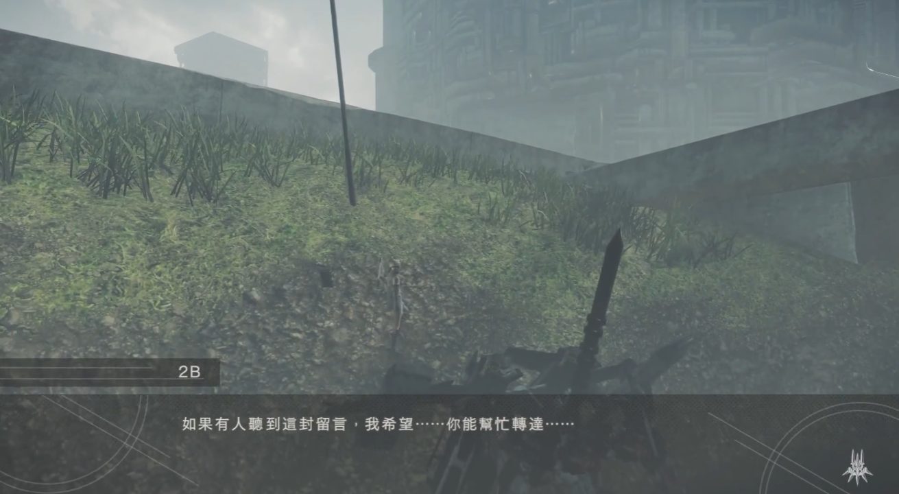 镜头拉回9S脱离战场后,在水没都市的塔附近桥下边缘的地方找到了2B坠落的飞行装置。这里会触发一个彩蛋剧情,那是一段没有来得及发出的信息,是2B留给9S的: