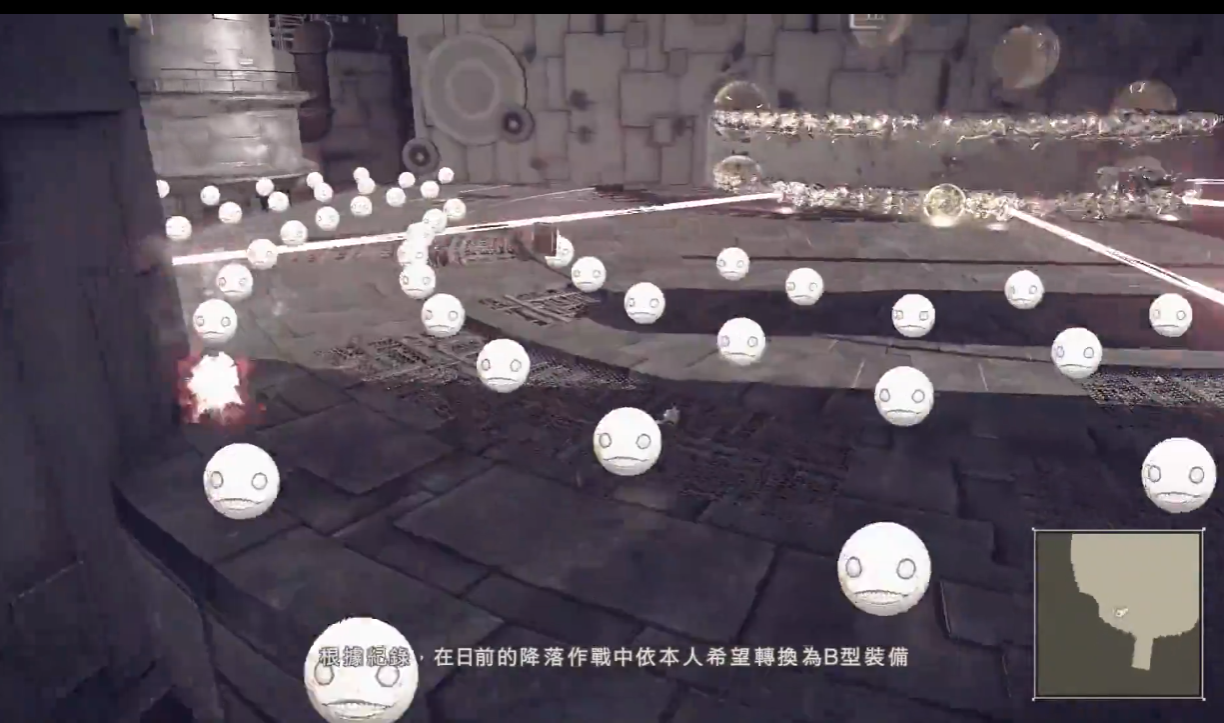 一波又一波的人造人冲向二人,显然此时地面上还没有被控制的人造人恐怕只剩他俩了。危机情况也顾不上其他了,9S利用上次在地堡服务器中发现的后门上传了二人的资料数据,再次启动黑盒自爆脱离战场。