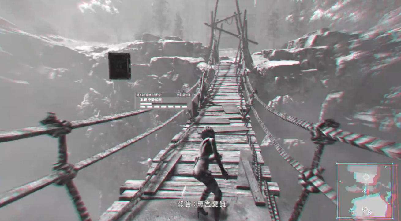失去理智的9S拔出佩刀在吊桥上疯狂的跑向A2,他此刻已经完全不考虑自己是否是A2对手的问题了,只想亲手杀掉这个杀死2B的凶手。刚刚跑过一半吊桥,桥下突然冒出了一根根白色的柱子,脆弱的吊桥几乎是瞬间断裂,无处借力的9S摔向峡谷,充满怨恨的声音从深处依旧传来。
