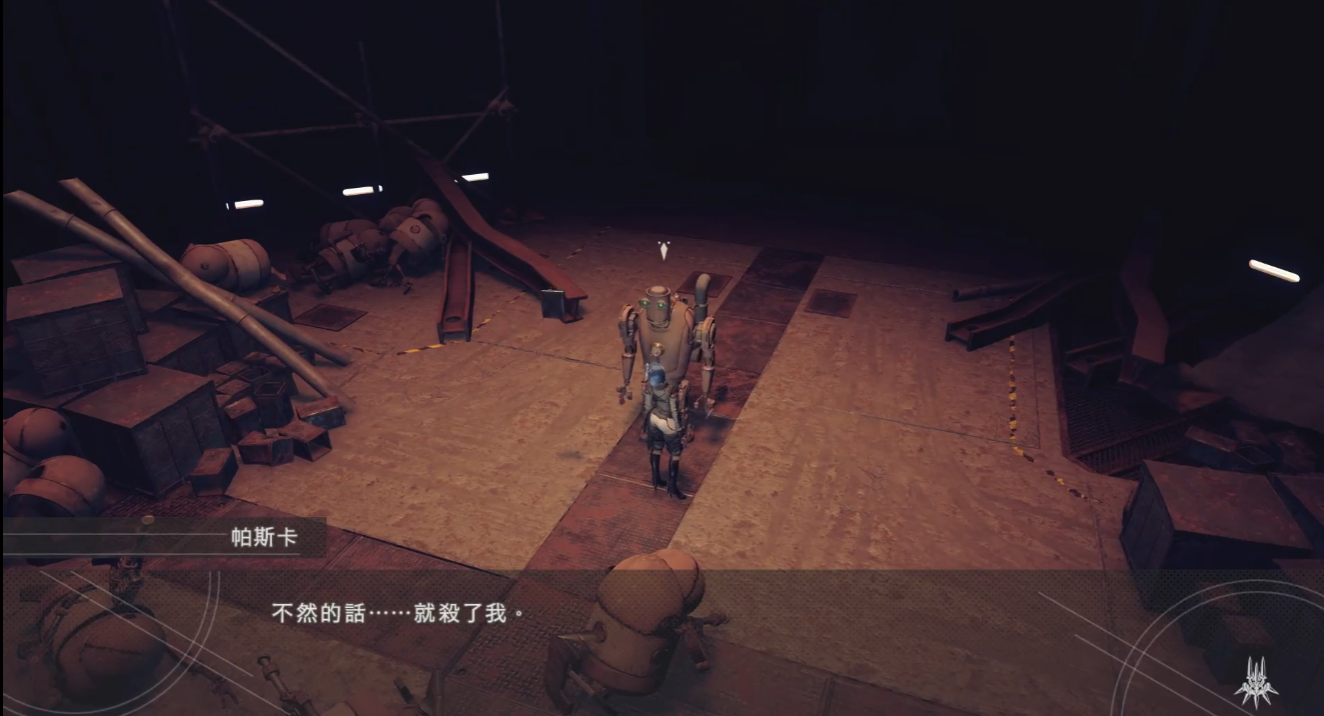 来到营地找到首领,A2熟练的和首领打招呼,她们果然认识。从她们的谈话中隐约可以看出她们之间在过去发生过什么事情。从首领的口中得知基地此时并没有她需要的零件,而生产这种零件的人竟然就是她刚刚救下的机械生命体帕斯卡。