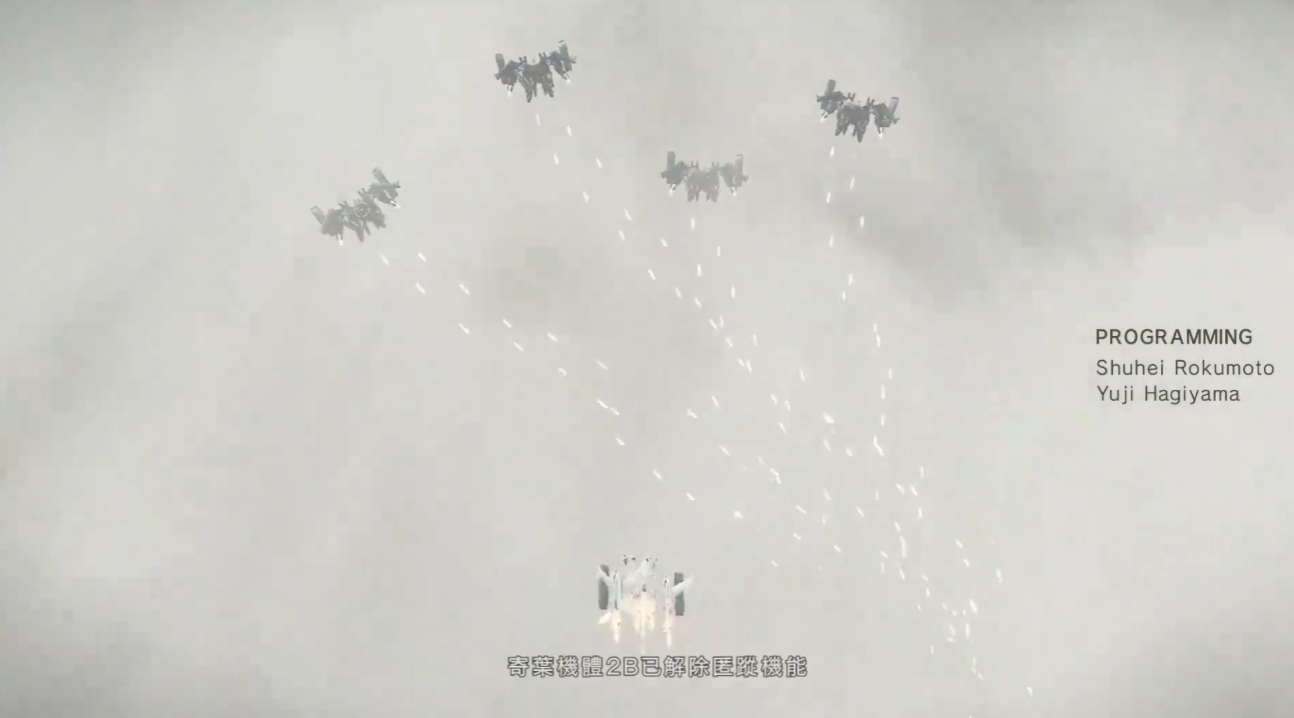 地堡爆炸的冲击波推动着二人的飞行器如陨石一般冲破大气层向地面降落。然而地堡的爆炸并没有毁掉其中所有的尤尔哈部队成员,还是有被感染的人造人驾驶飞行器追了上来。尤尔哈部队都是作战精英,战斗力远非地面上那些机械生命可比,此时又驾驶着尤尔哈部队最先进的飞行作战装置,一时半会儿根本无法逃脱,这样下去二人都没有生还的可能。胶着之时,2B接管了9S的飞行机体,设定了自动航行目标脱离战斗区域,而2B则是解除了自己的隐匿能力,最大程度吸引敌方为9S的逃离争取时间。
