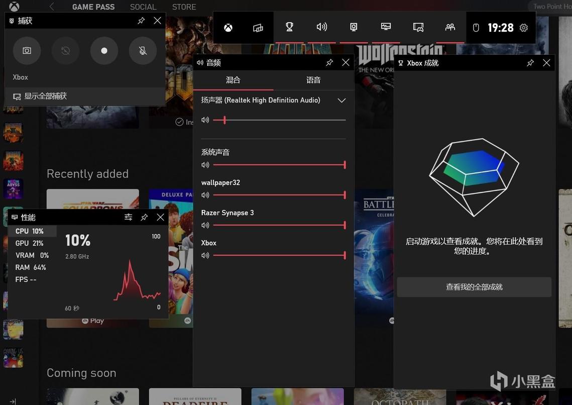 Win+G快捷键可以打开游戏内覆盖功能,可以方便截图、录屏、查看成就获得情况以及系统资源占用。还可以跟好友语音,不过有时候网络不稳定。