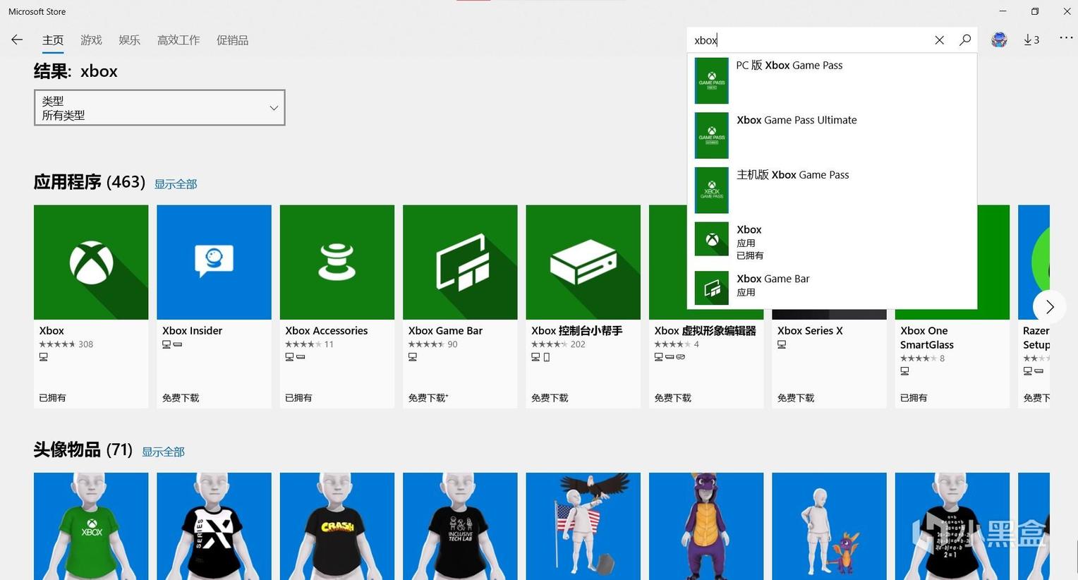 在Microsoft Store右上角点击搜索栏,搜索Xbox,如图所示下载第一个应用就行。