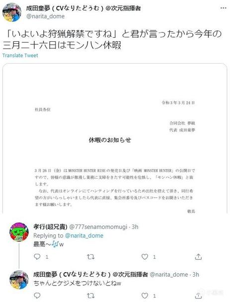 为了迎接《怪物猎人崛起》的发售,日本许多公司都选择在26日这一天提前放假,比如日本前东奥国手成童梦今天就直接给自己的公司发布放假通知,并称之为“怪猎放假”