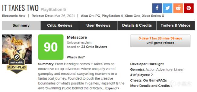 由《逃出生天》开发商Hazelight制作的《双人成行》近日解禁了媒体评测,这款再次主打双人合作的游戏获得了多家游戏媒体的好评。MC综合评分网站目前收录了23家游戏媒体的评分,其中16家媒体给出了90分以上的评价,目前《双人成行》以90分的综合得分获得了MC的MUST PLAY标识。