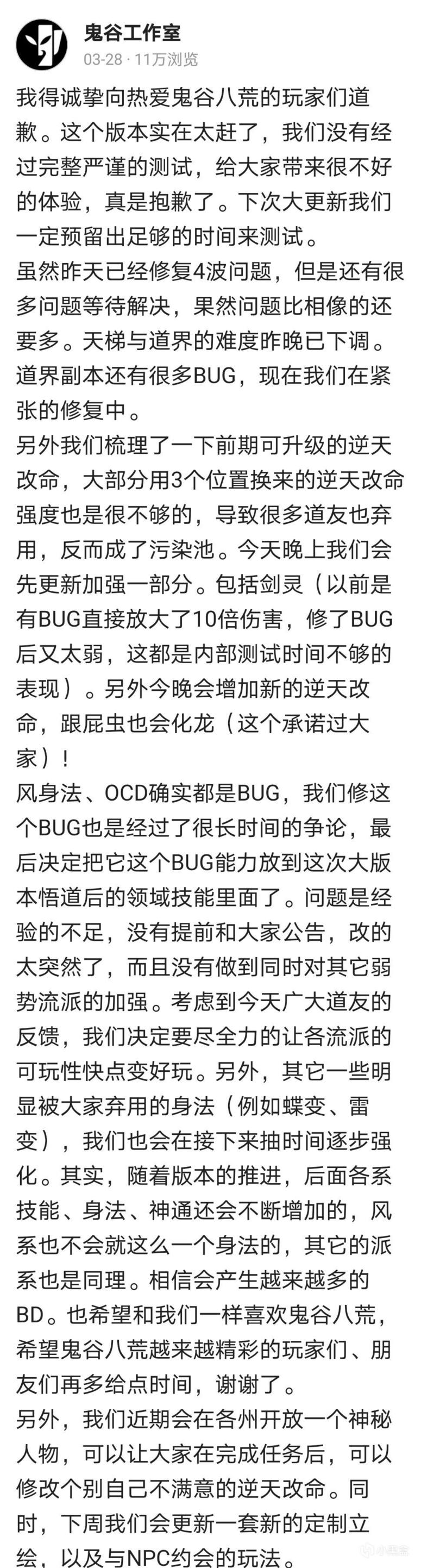 官方又是什么态度呢? 27日14时更新,15时修复了bug,19时再次修复bug,22时重名鸟大砍一刀,天梯被锯短,28日长文道歉,29日化神境界的道境副本也喜提大塌方,30日恢复了风剑机制并为此道歉。