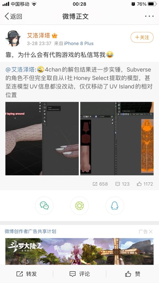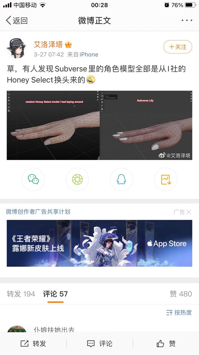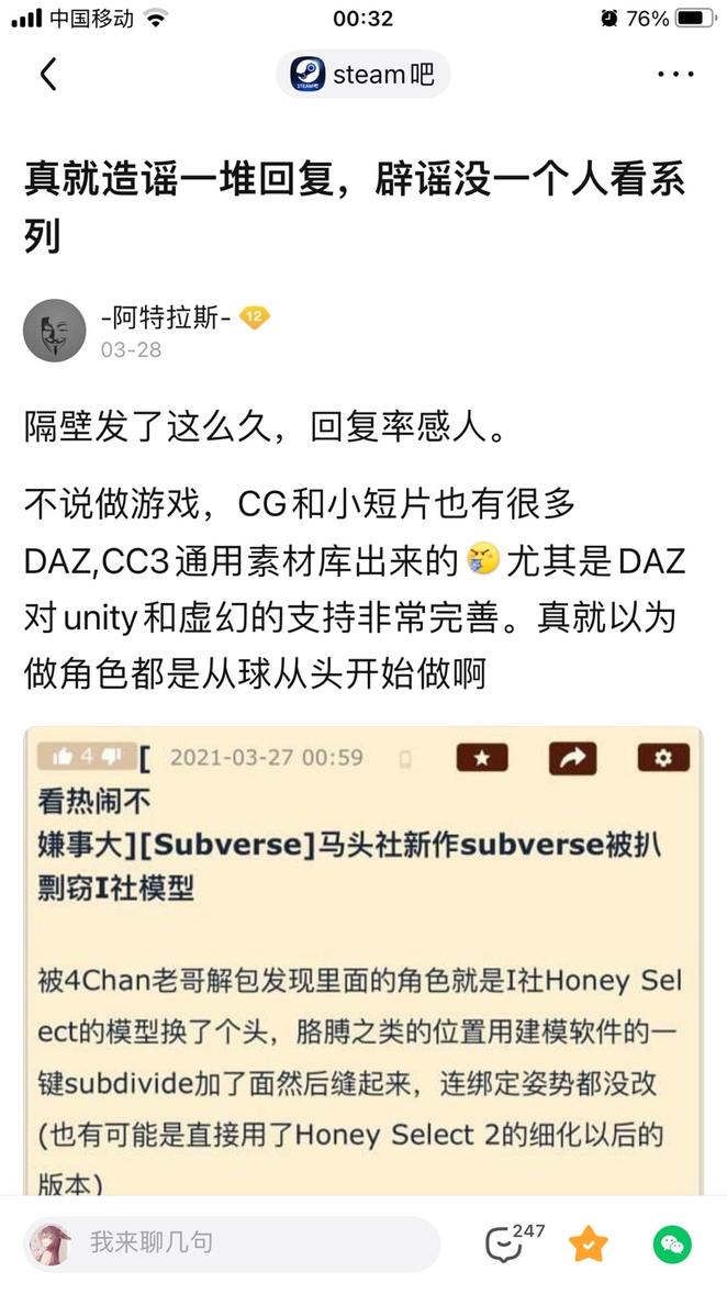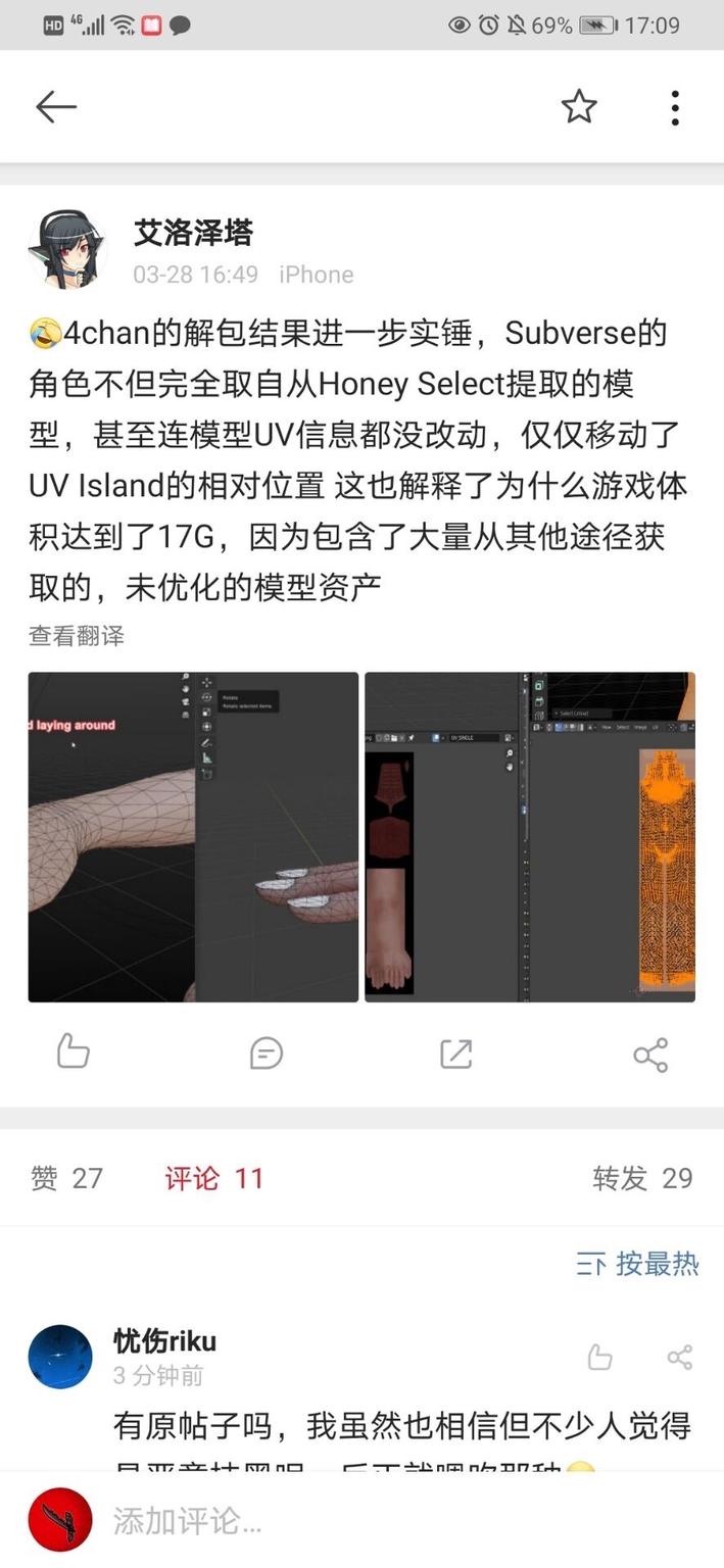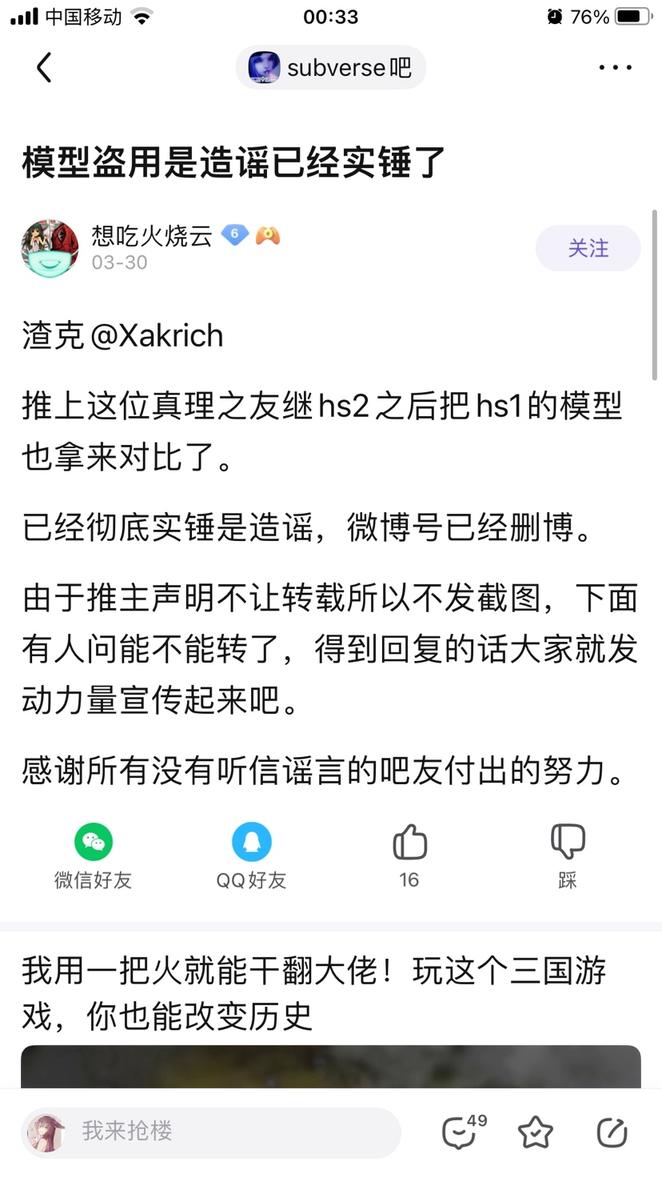 此时本次事件已经在微博和贴吧引起了热议,并且在贴吧和推上已经有热心玩家对此事进行了技术上的取证和证明。但是得出的结论与微博用户艾洛泽塔和4chen上的结论完全相反,HS2的模型和subverse还是有本质上的去别的。(由于用户要求,此处不展示内容与个人id。详情请去推上搜索subverse模型这一关键词,此处仅展示贴吧结论贴)