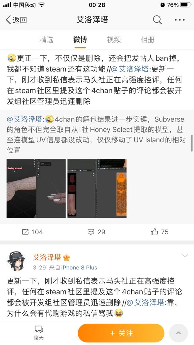 在随后的几篇完全没有证据佐证微博中声称马头社在steam和4chan进行控评,而他自己在微博上控评的解释为对付水军和js的手段。并且在评论区中和自己的微博内容中隐含的表达出自己是project h的相关人员和有一定建模技术的人员,但是到此时此人仍未对之前的指控给予详细的证据证明自己的观点。