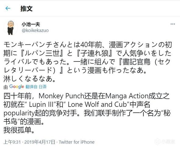 小池一夫悼念Monkey Punch的推文,发文当天本人也因肺炎去世