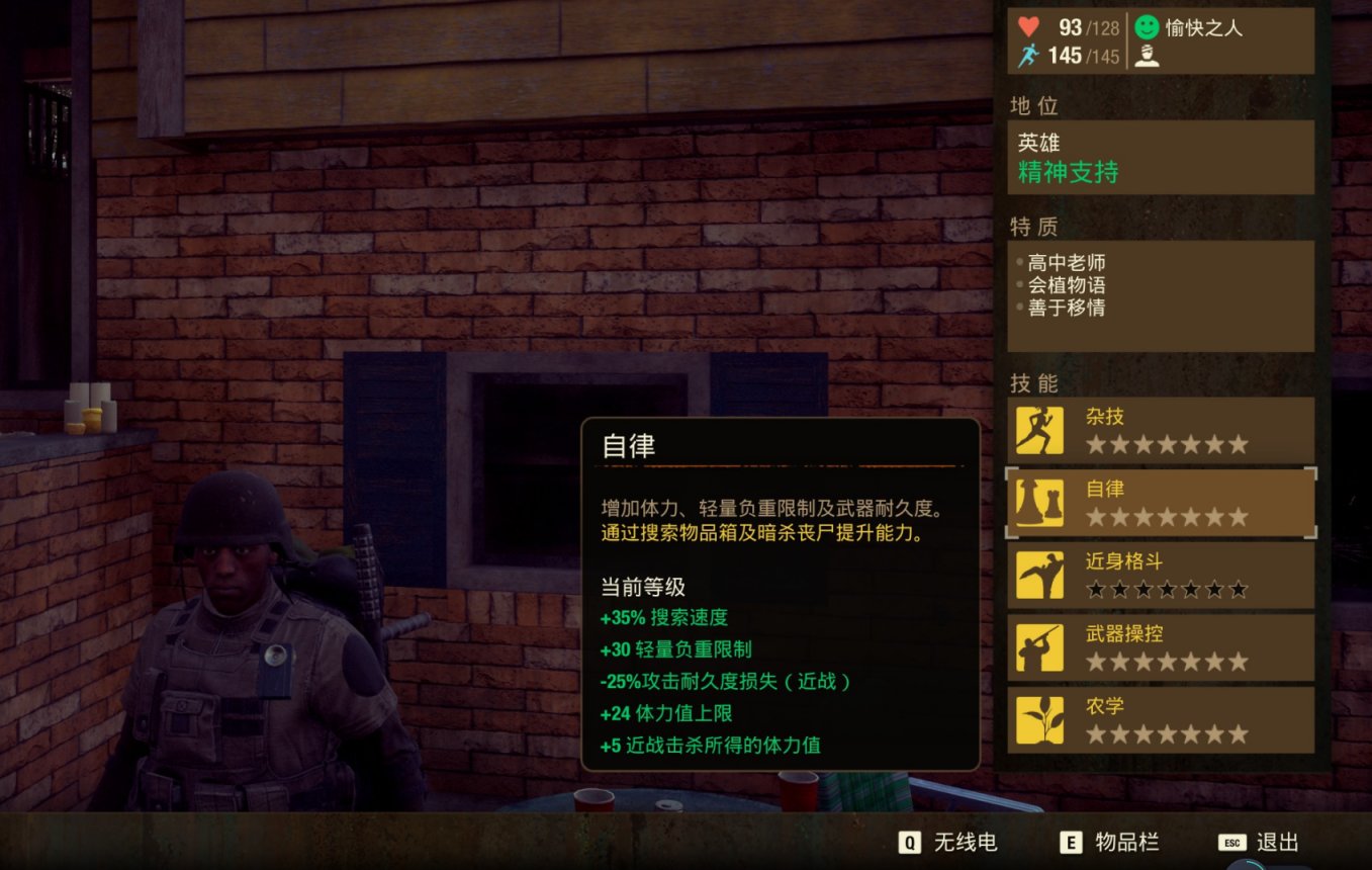 2. 自律——+35%搜索速度、+30轻级负重、-25%每次近战攻击的武器耐久消耗、+24最大耐力