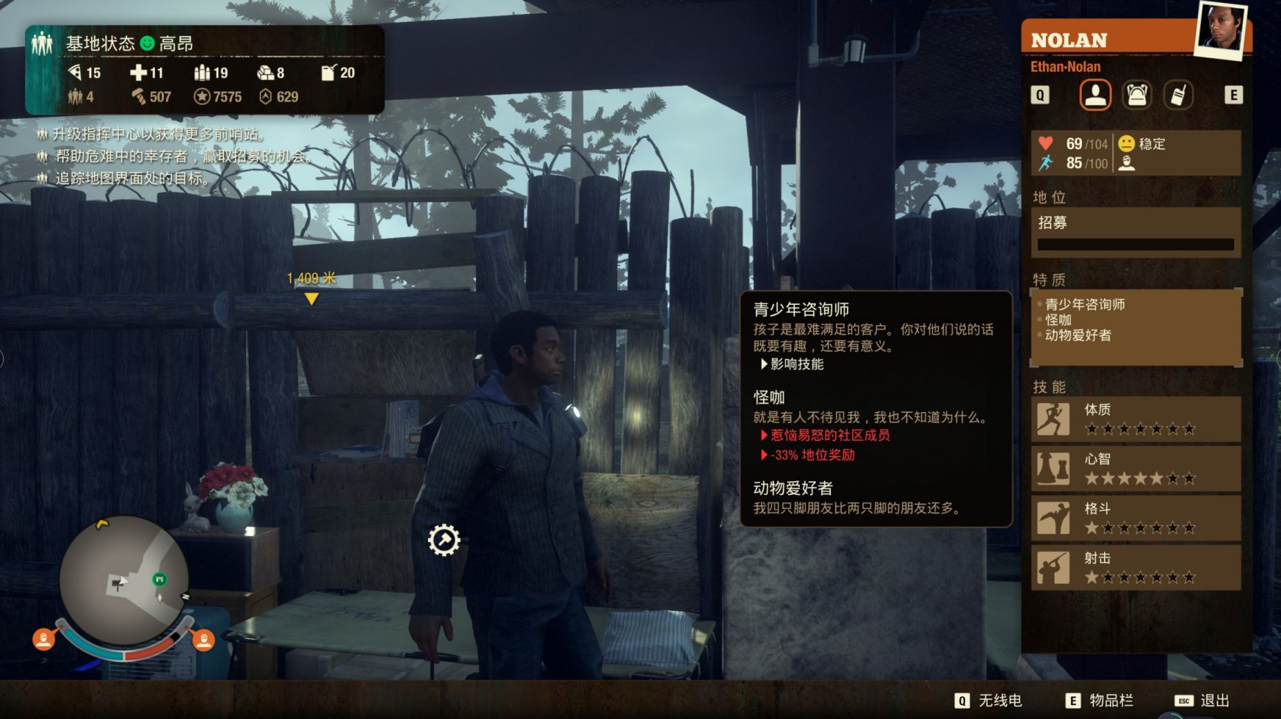 2. 亚裔小子——“睡在树上”——士气奖励,来自室外床位,影响技能(通俗地讲,就是你把床建在外面,他就会发动技能提升整体士气。)