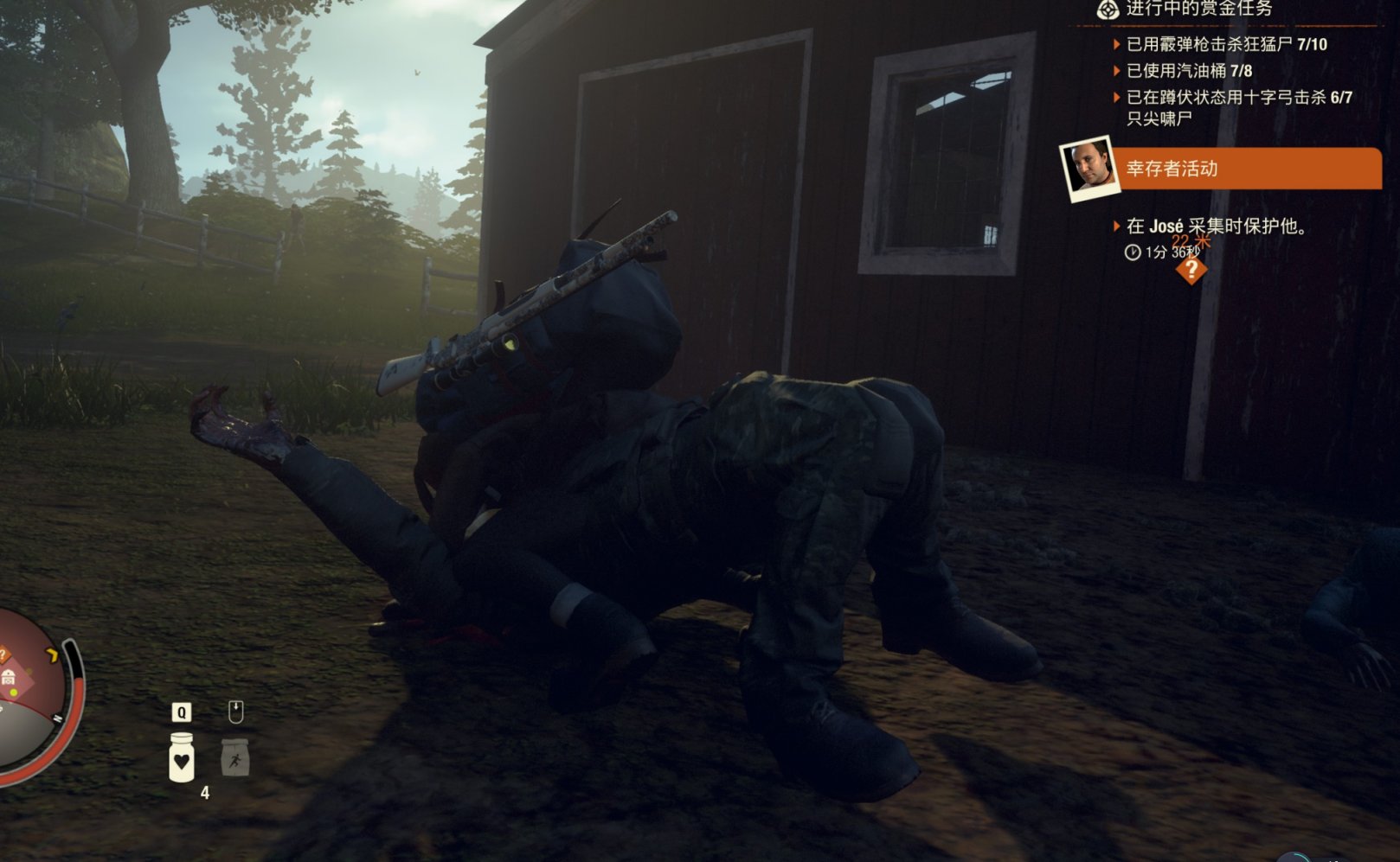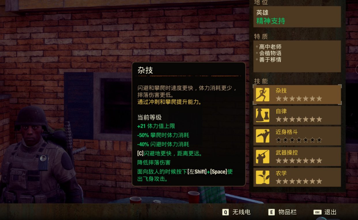 3. 杂技——+21最大体力、减一半攀爬体力消耗,-40%闪避体力消耗,降低摔落伤害。肉搏时变膝撞