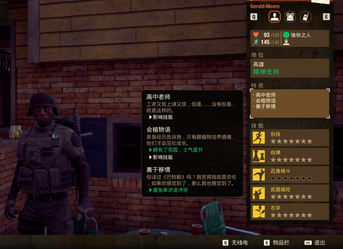 (1)宽肩(加15最大携带量) (2)养蜂人(加30最大健康)(3)乐于助人的(加4士气) (4)自信(加20最大生命值,加50%影响力)