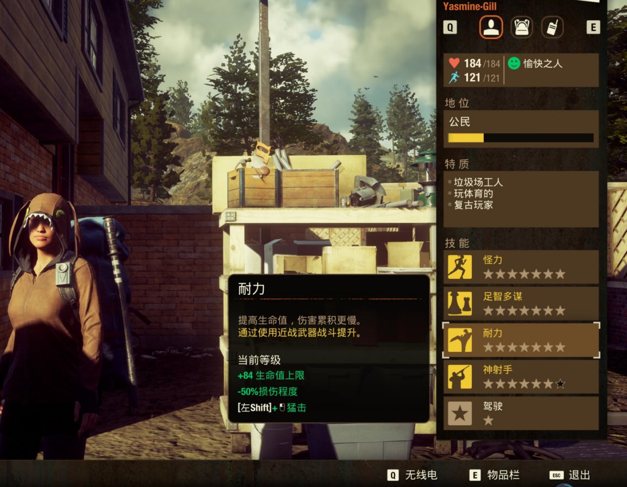 1. 耐力——+84最大生命、-50%受伤程度,可使用过肩摔