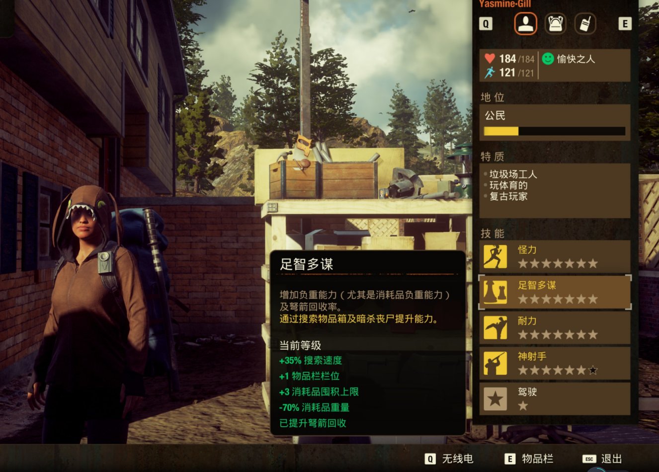 4. 足智多谋——+35%搜索速度、-70%消耗品重量、+1物品栏位、+3消耗品囤积上限,提升弩箭回收