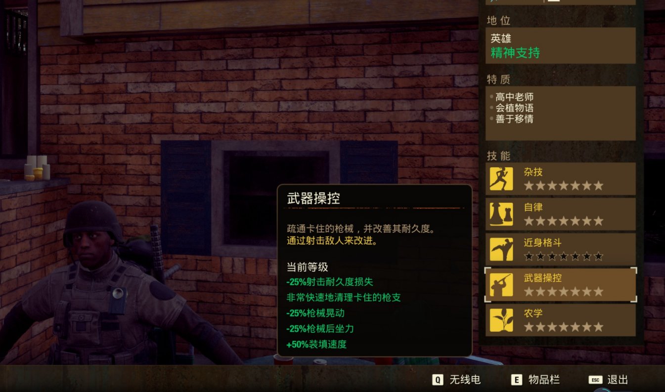 每个人物都有通用的四大技能,分别是:耐力、侦查、战斗以及射击。