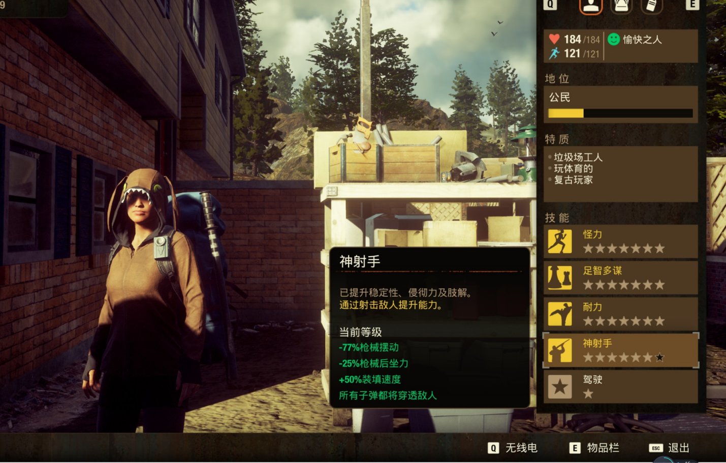 每个技能都设有星级,星级满了后可以选择升级为专精系列。至于如何升级,照着技能做就好了,耐力一星的耐力槽就小,你可以来回来去的跑,慢慢就会升级;不停地开枪打丧尸(弩箭也可),就会升级射击技能;总也蹲着走自然而然会升级侦查能力。下面说一说专精技能走向: