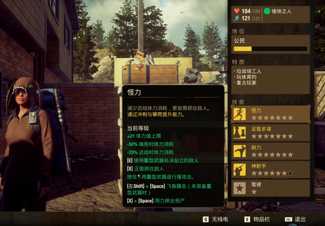 4. 怪力——+21最大体力、-50%擒抱时体力消耗、-25%近战体力消耗,并解锁飞身踢和暴力抓取