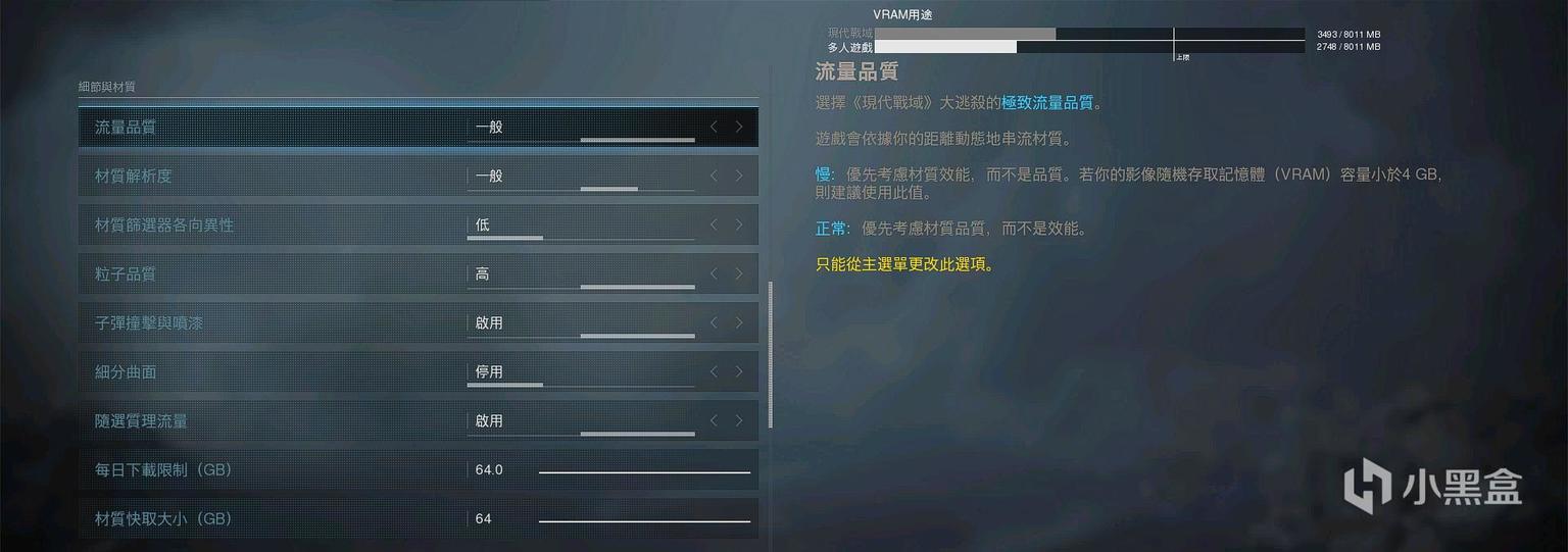 流量品质针对战区的设置,低和一般,看右侧的显存条,那个条不建议超过80%,否则游戏容易崩溃,最好控制在60%以内。