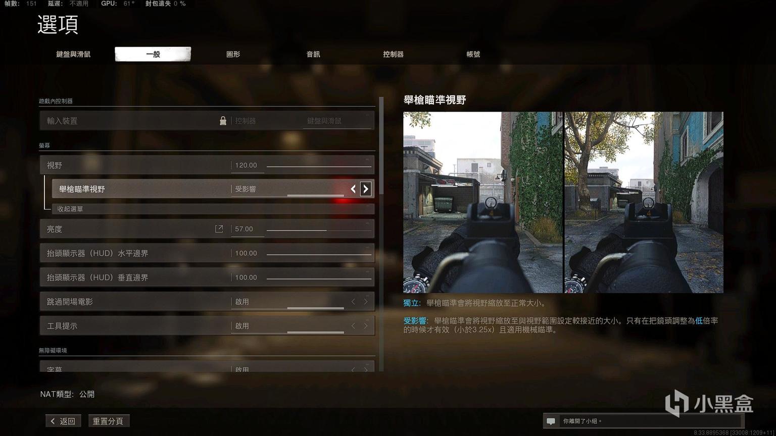 视野选项一般都是拉满,举枪瞄准视野我后来改成了受影响,亮度57