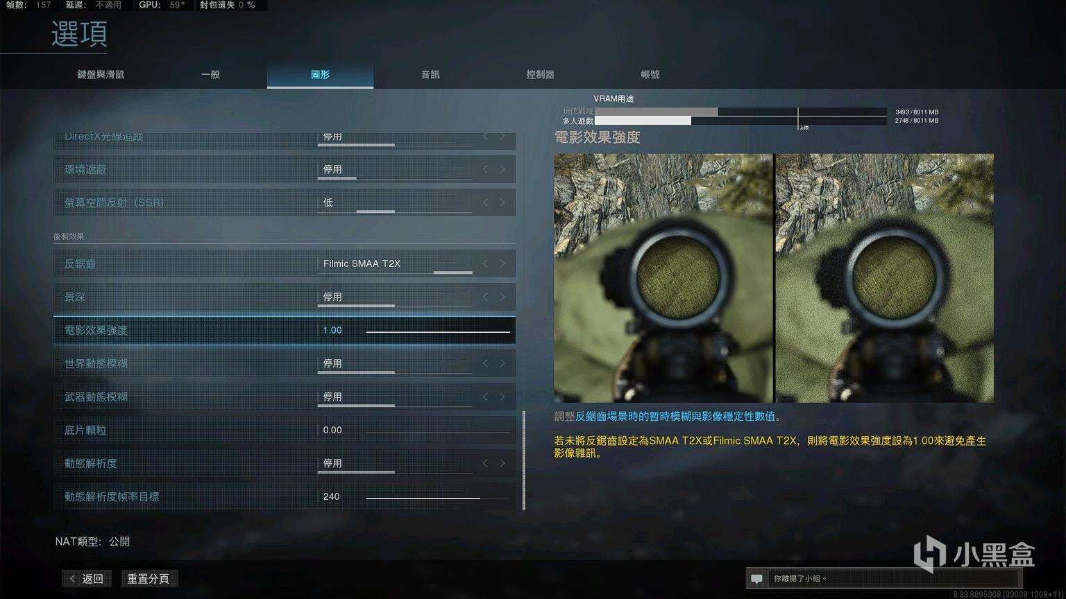 电影效果强度,如果你前面和我一样用了NV控制面板的锐化或者是NV滤镜中的使明朗,就把这一个选择拉满,两个设置结合在一起可以有效降低中远距离的锯齿狗牙。