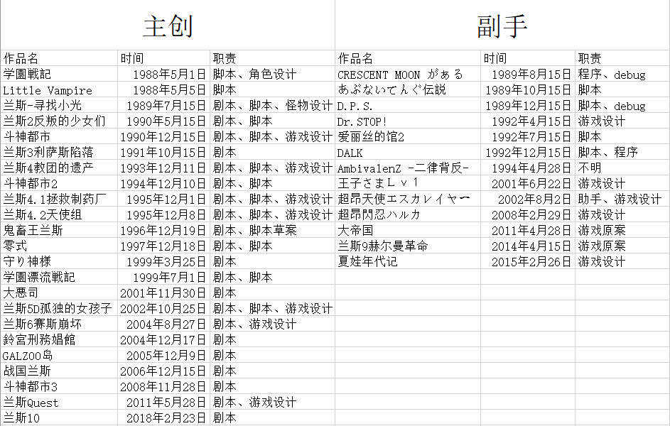 还有就是具体作品的问题,《DALK》这部作品TADA说是以他自己和ぷりん为核心制作的,但VNDB说是ぷりん主导的;《王子さまLv1》是A社旗下乙女向分社AliceBlue的作品,TADA是否会算上它真不一定;《AmbivalenZ -二律背反-》在VNDB中只说是“其他工作者”,只能列为“不明”;《D.P.S.》有多部作品,这里只列出了第一部的时间与工作;兰斯9中TADA并不算是主要人员,主要负责人是ぷりん,TADA只做了剧情原案、部分脚本和H内容的事,因此将其归为副手;最后一点是退休后的TADA还神奇的参与了《同级生RE》的制作,虽然只是特别鸣谢里的...也不知道TADA又去干了啥,也许只是找他们的工作人员聊了聊天吧。