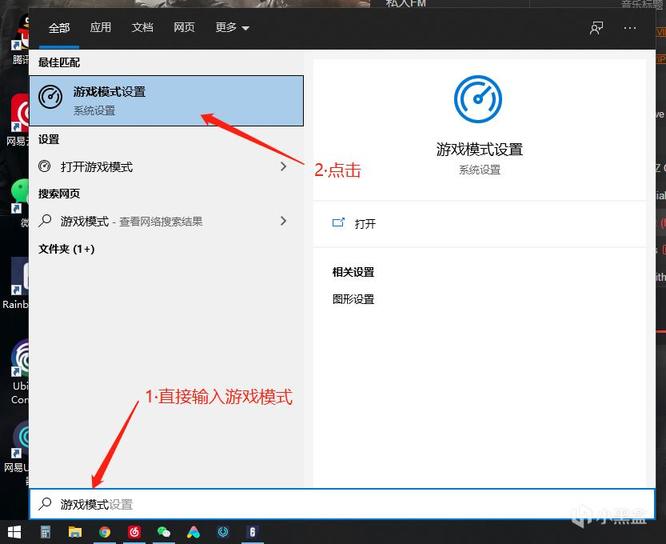 1,点击左下角window图标,然后直接打字游戏模式,在跳出来的界面选择游戏模式设置