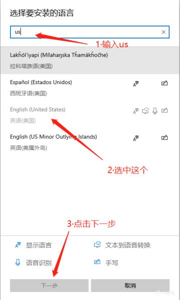 3,在弹出的输入框里输入us,然后选中英语(美国),点击下一步