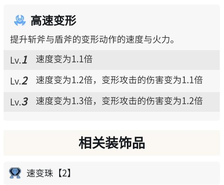 本作中新增了技能高速变形,增加盾斧斩斧变形斩的伤害和速度,招式名字中带变形字样的都会享受这个技能的加成。这个技能对斩斧的加成非常强,是配装必备技能。斩斧是一个需要不断切换形态利用变形斩打伤害的武器,速度增加也让一些怪物倒地时的打桩手法发生了改变,推荐早点配上,一个上位泥翁头加个珠子就搞定了。