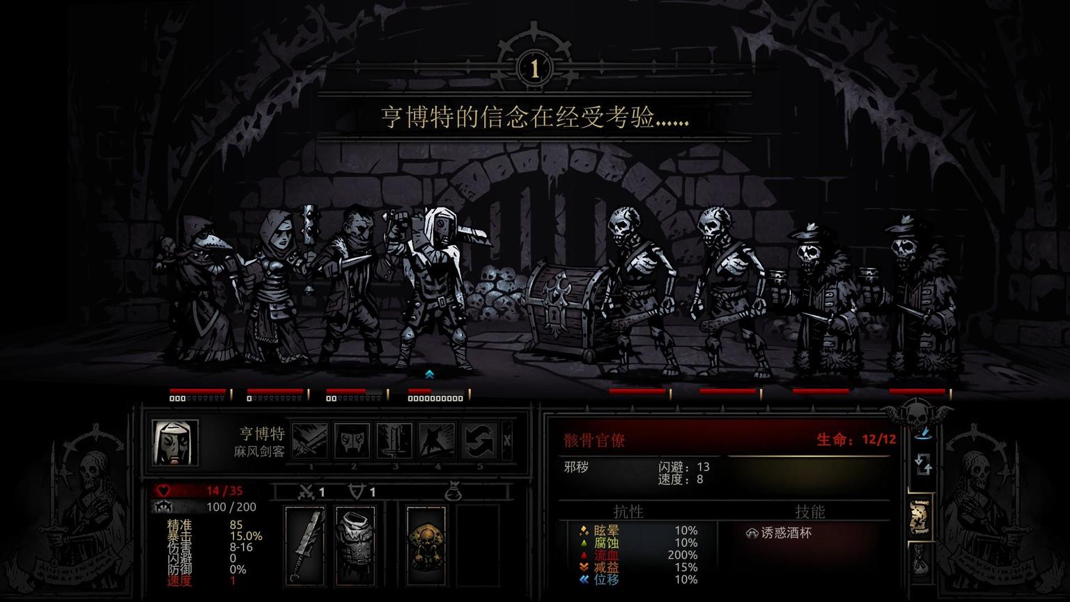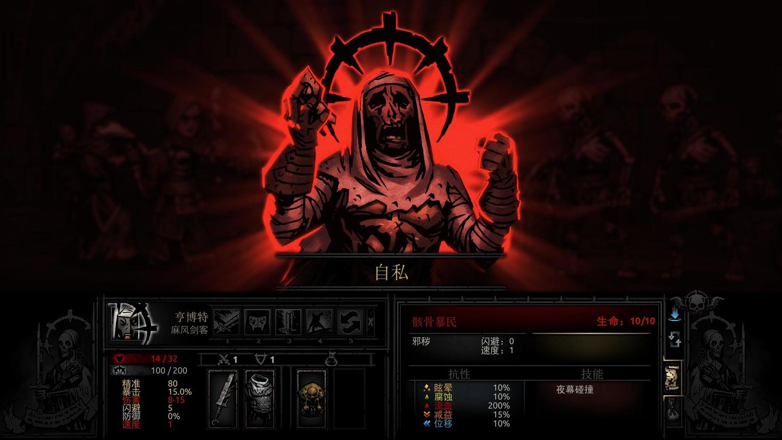 先从游戏中的行动顺序机制谈起。在《暗黑地牢》中首先对于在行动顺序的考量上就引入了随机性的机制,人物的速度(显示在图片左下角)(图中麻疯剑客的速度为1)根据不同人物而不同,而在每回合战斗中都有正负8的速度修正,这导致了每回合时我方与敌方行动的先后顺序是不同的,即存在着极为频繁的“抢速“现象。运气好的时候可以毫发无伤解决战斗,在运气差的时候就会陷入战斗的被动状态中。精准与闪避,暴击,已经广泛运用于各大RPG中,命中=精准—闪避,更高的命中可以带来更好的风险规避,而更高的暴击带来了更快解决战斗的可能性。伤害的随机性,我方造成的伤害是一个随机阈值,如上图中麻风剑客对前排敌人的输出可能导致三种结局:被闪避、输出低于敌方血量的伤害敌人存活和输出超过敌方血量的伤害敌人死亡 。敌人的AI和攻击逻辑,敌人攻击方式(显示在图片的右下角)的选择和攻击逻辑是不可视的,攻击产生的结果也是难以预料的。
