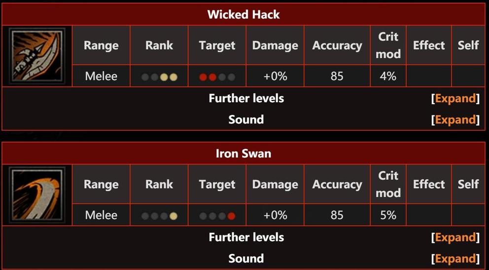 比如《暗黑地牢》输出一姐“蛮族战士”的技能设计是个非常典型的例子,如上图中的技能“邪恶挥砍”(图上)只能攻击1、2号位置的敌人,而技能“钢铁天鹅”(图下)可以攻击到4号位置的敌人,而4号位的敌人在《暗黑地牢》中虽然很脆弱,但威胁性更大,是需要优先解决的存在。虽然“恶女”这个角色输出并不是最高,但在暗黑地牢的角色梯队由于站位系统的存在,使得恶女为第一梯队的人物。通过站位系统,使得暗黑地牢的战斗脱离了平面,成功地营造出了立体感,颇有《XCOM2》的既视感。